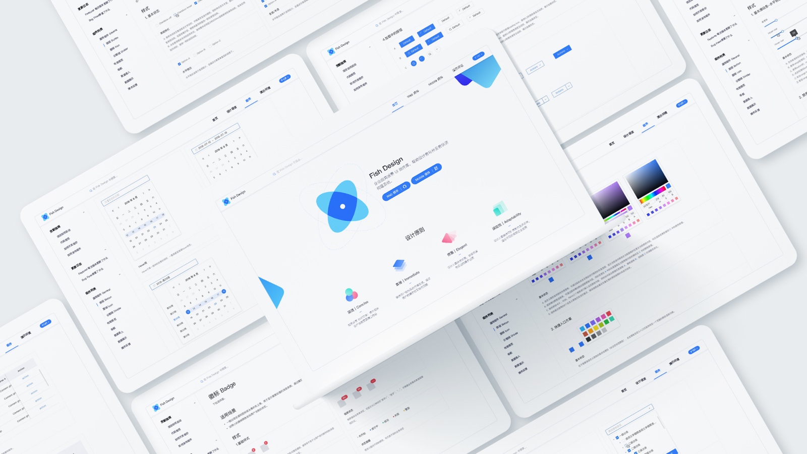 因為組件API的存在,我們可以將同一個組件適配不同的產品風格,並且基於改造後的組件庫,構建產品的整體框架規範。比如下圖中的三個產品,雖然他們的風格不同,但都是使用FishDesign組件庫進行API定義的。