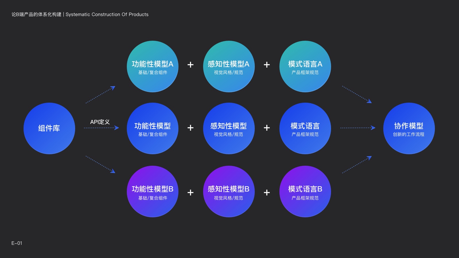 通過分析B端產品的構建方式,我們可以發現:不同B端產品的構成方式是相同的,區別僅在於產品的風格(感知性模型)和模式語言(產品的框架規範)的差異。而產品的組件庫、協作模型以及快速搭建流程,都是可以在不同的產品中進行複制粘貼的。