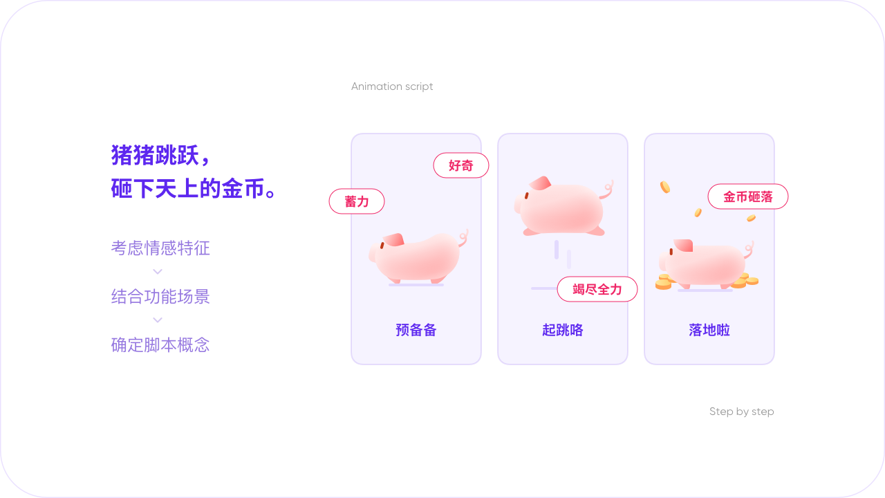 假設在項目中我們需要對設計元素(豬豬存錢罐)添加動效以提示用戶已省錢成功的情感氛圍。設計前我們先來分析下元素以什麼動態/動作表現會更貼合元素性格。考慮到豬豬的可愛屬性,採用了跳躍的運動方式。並擬定了跳躍後天上落下金幣的動畫腳本。