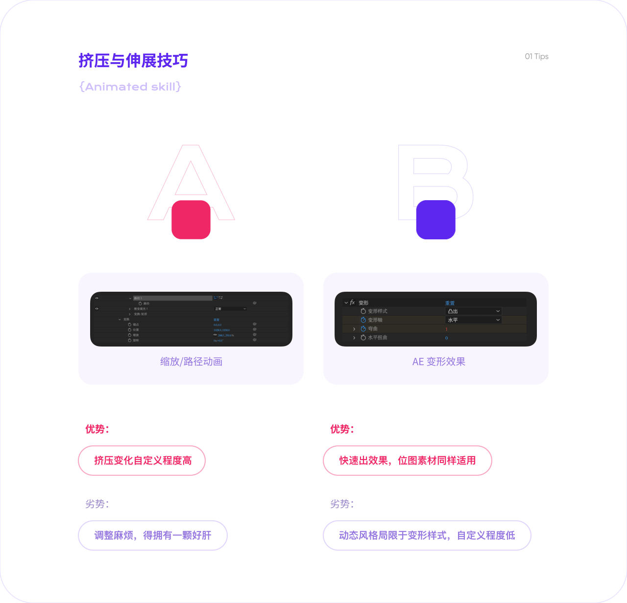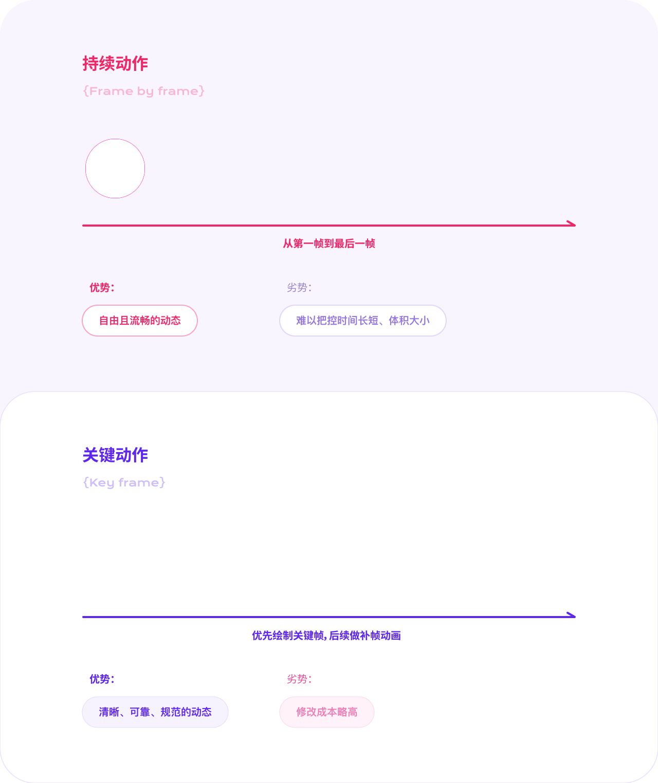在現今動畫工作流程中,考慮到流程效率及技巧利弊,我們可以使用兩者相互結合的方式。關鍵動作描述的是設計師們熟知的關鍵幀動畫的方式(類似AE)。在動畫設計前進行基本運動的關鍵動作提煉,再進行細化,一層層的遞進。底層的關鍵運動越完善,在後續添加細節時才不會耗費大量時間調整。而對於持續動作(逐幀動畫)的技巧,我們可以利用它處理一些複雜效果例如(涉及到運動空間的變化、形狀上的靈動變化等)。
