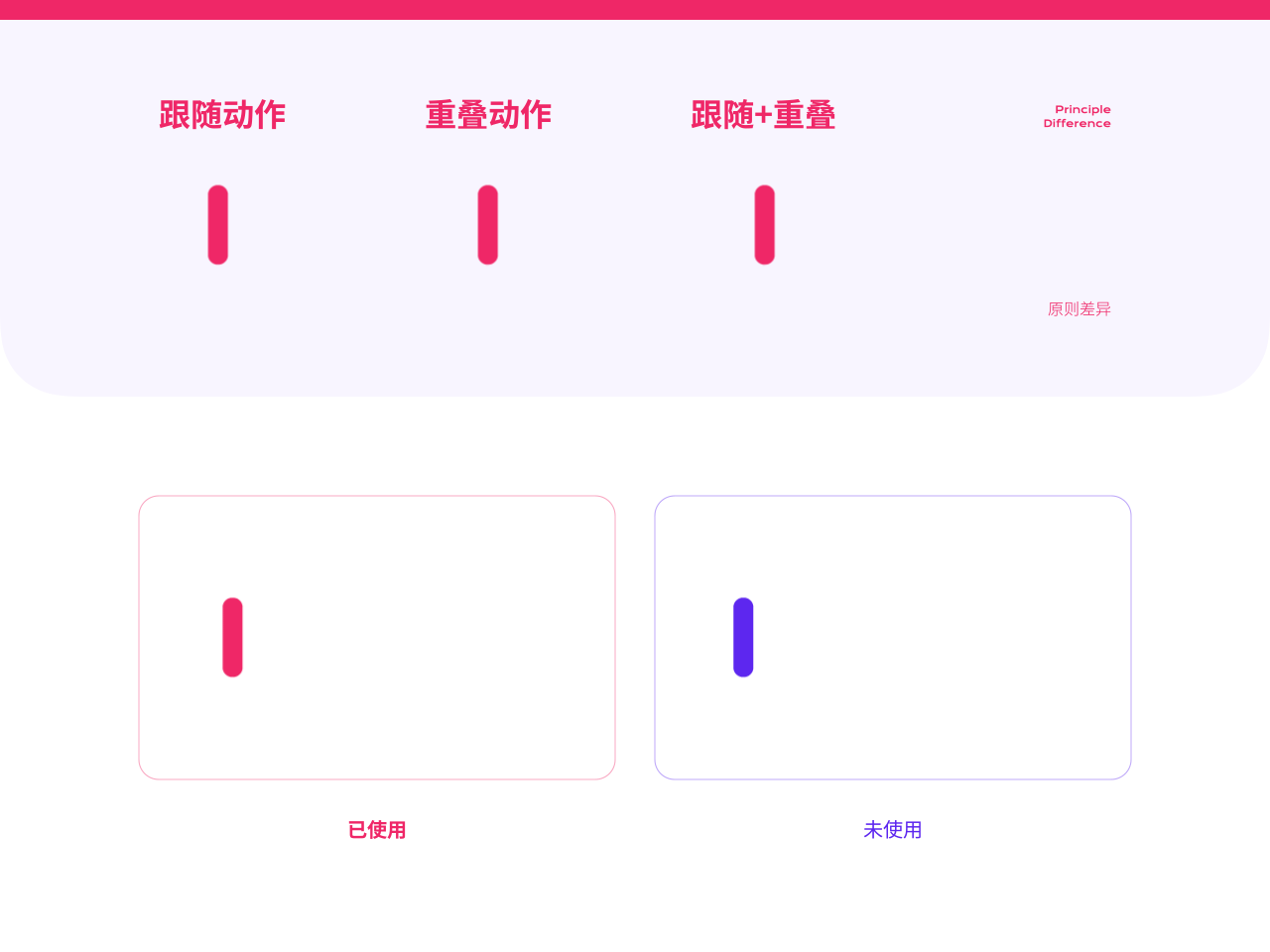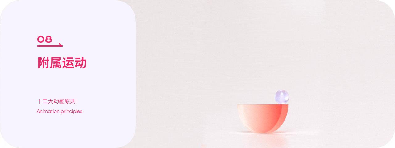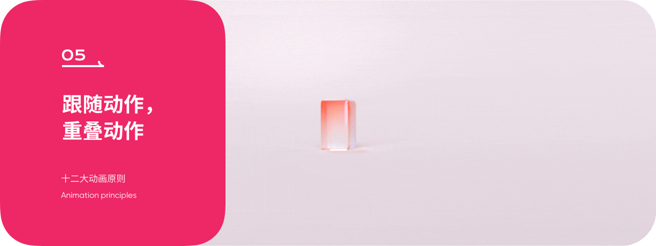 跟隨動作指的是元素運動結束後不會立刻停止,會因為質量、慣性等因素,元素會慢慢進行振動減幅的過程。重疊動作則指的是運動不會同一時間發生,主體與附屬部分的運動會因質感、外力等因素產生不同的速率。
