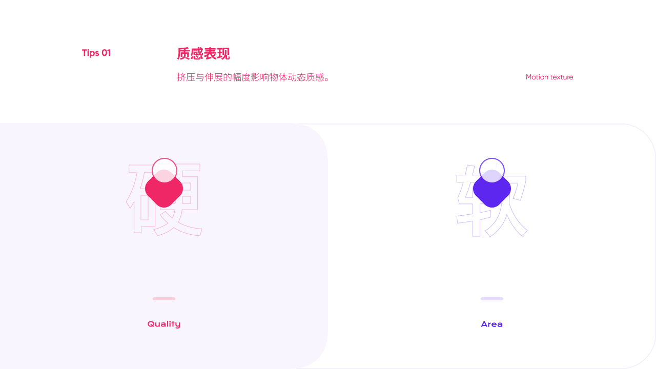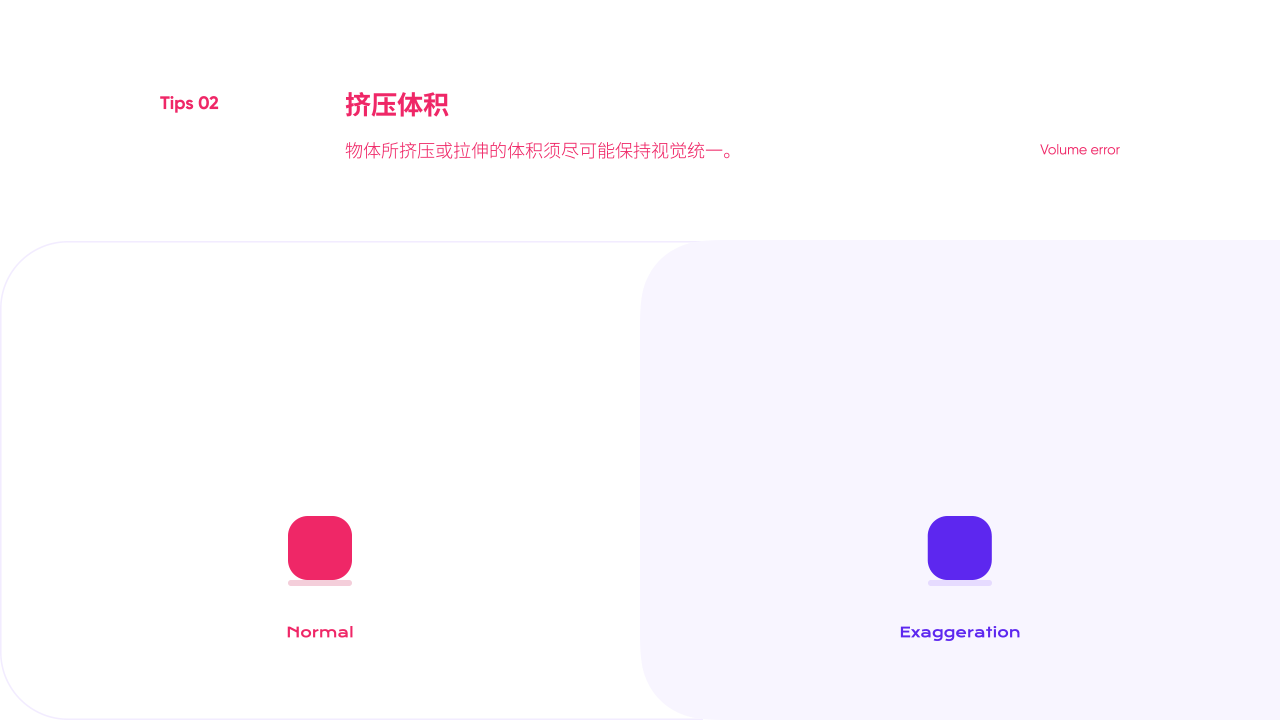 擠壓與伸展的幅度影響著物體的質感、重量。設計師們可根據物體的質感去決定擠壓伸展的幅度。動畫雖存在誇張性,但對於物體擠壓拉伸的體積盡可能保持視覺統一,避免較大的體積誤差導致運動的突兀。