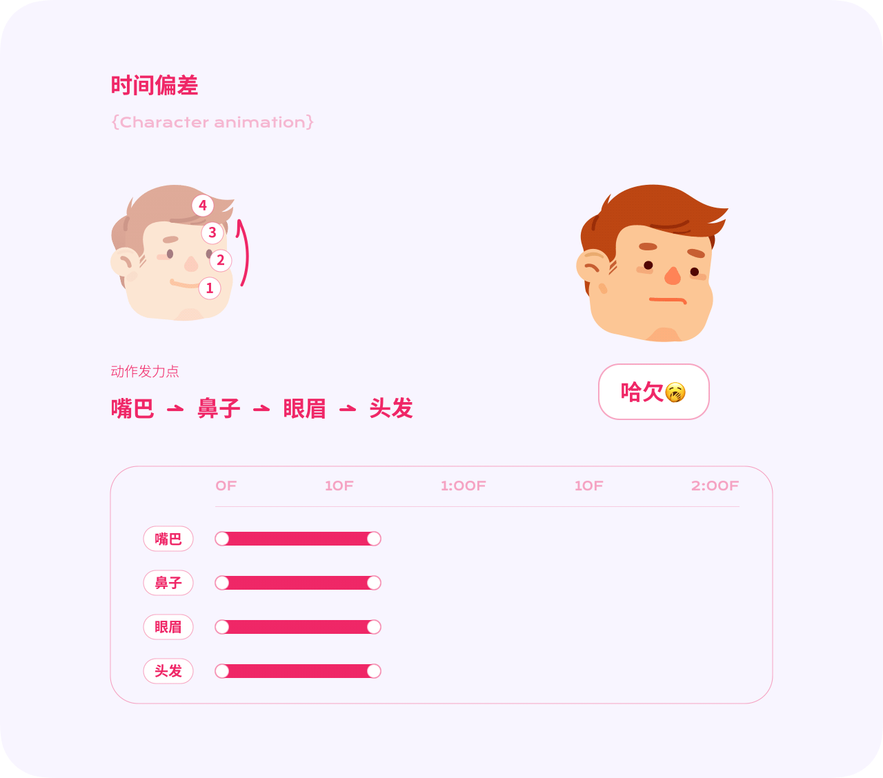 使用「時間偏差」的技巧,可以讓你的動畫更加生動。因為受力、質感等因素影響,主體運動時附屬部分的運動不會同時發生。比如當人物正在打哈欠時,首先是從嘴巴發力,再擴散至五官眉毛。