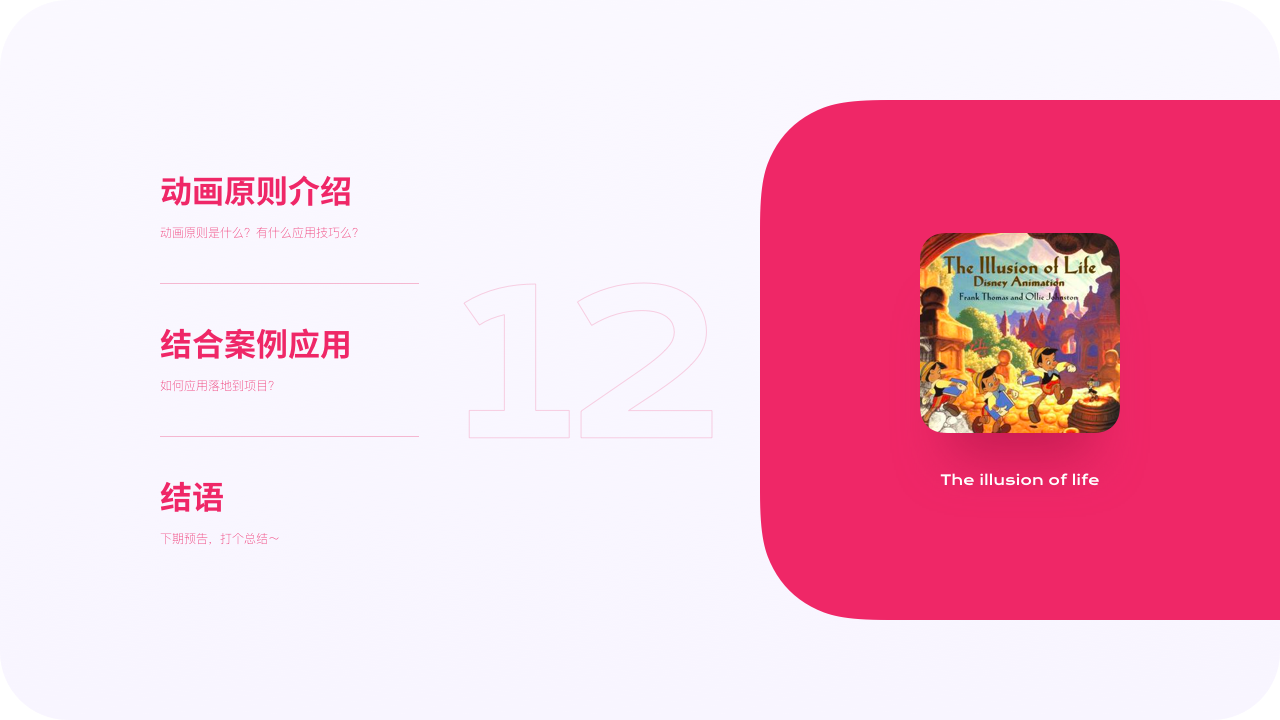 前人早已總結了讓動畫生動的技巧,早在1981年由兩位迪士尼動畫師所撰寫的《The illusion of life:Disney Animation》一書就提到了動畫的12項基本法則,該法則也是受用至今。法則雖是針對傳統動畫而製定,但對於我們日常需求中所接觸的動效/動畫需求也同樣受用。