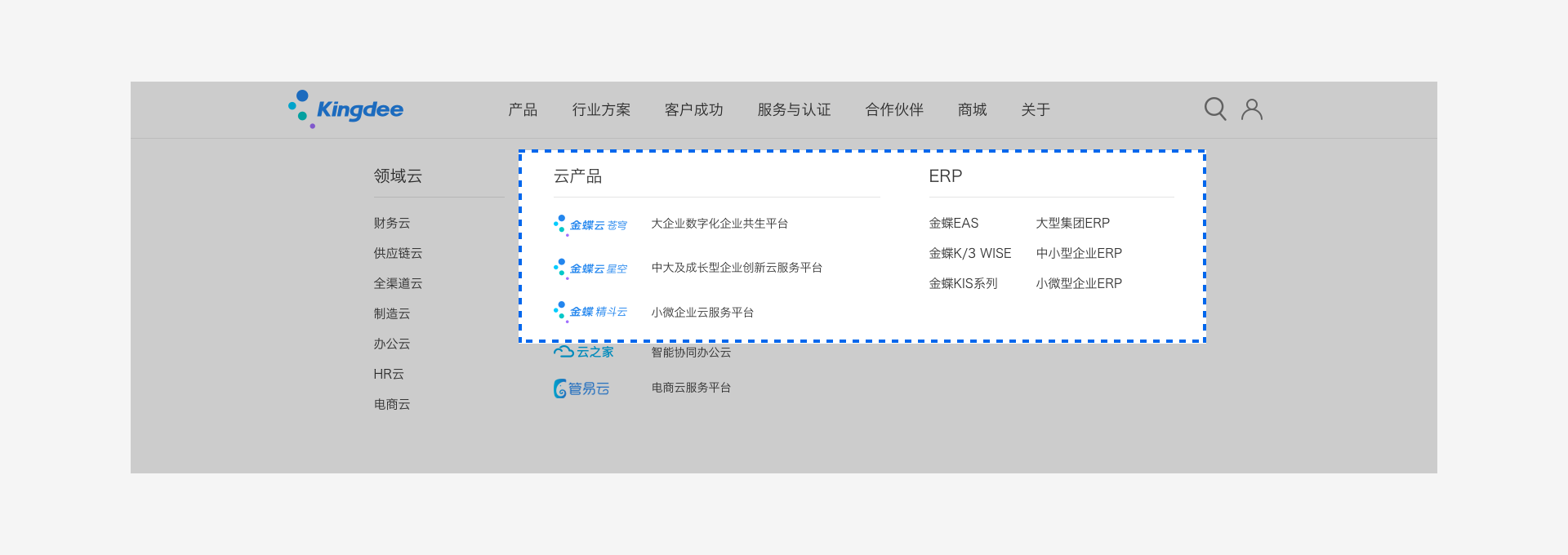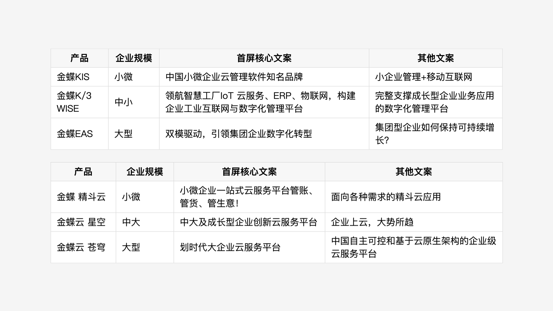第一個案例來自金蝶軟件,在產品導航上我們就可以看出,無論是通用的雲服務還是相對垂直的ERP軟件,都按照企業規模直接劃定了產品間的界限。分別點開不同產品頁面,仔細體會其中文案的著墨點,這裡摘取部分供參考: