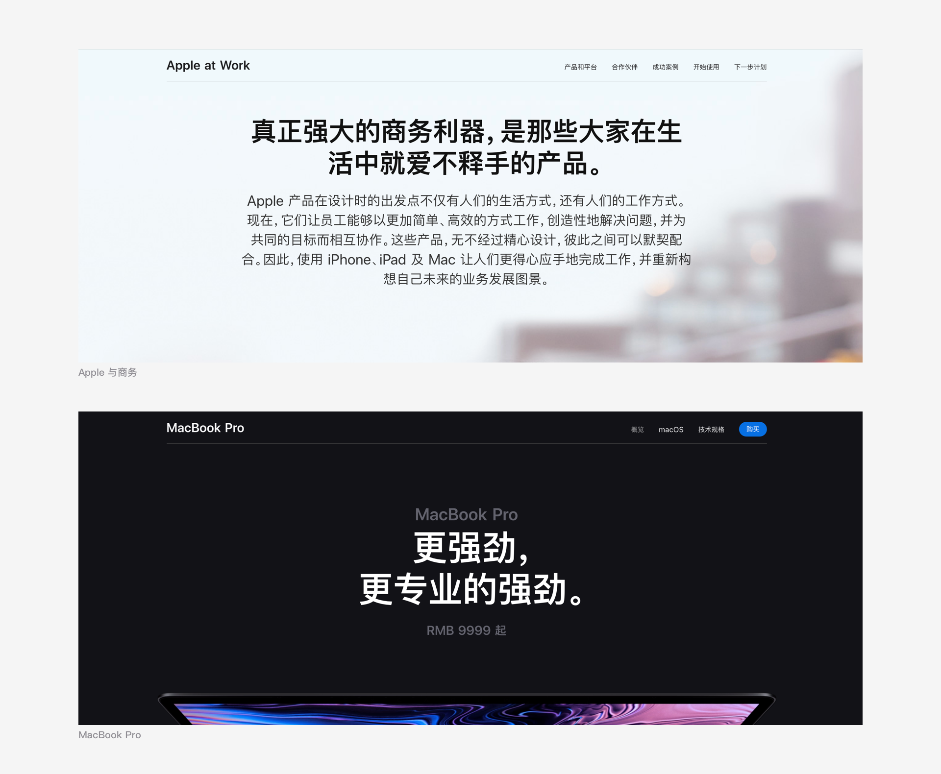 下圖是來自蘋果中國的案例,同樣是一個主題的頁面首屏,toB的Apple at Work與toC的消費級產品MacBook Pro的文案有較為顯著的差異。
