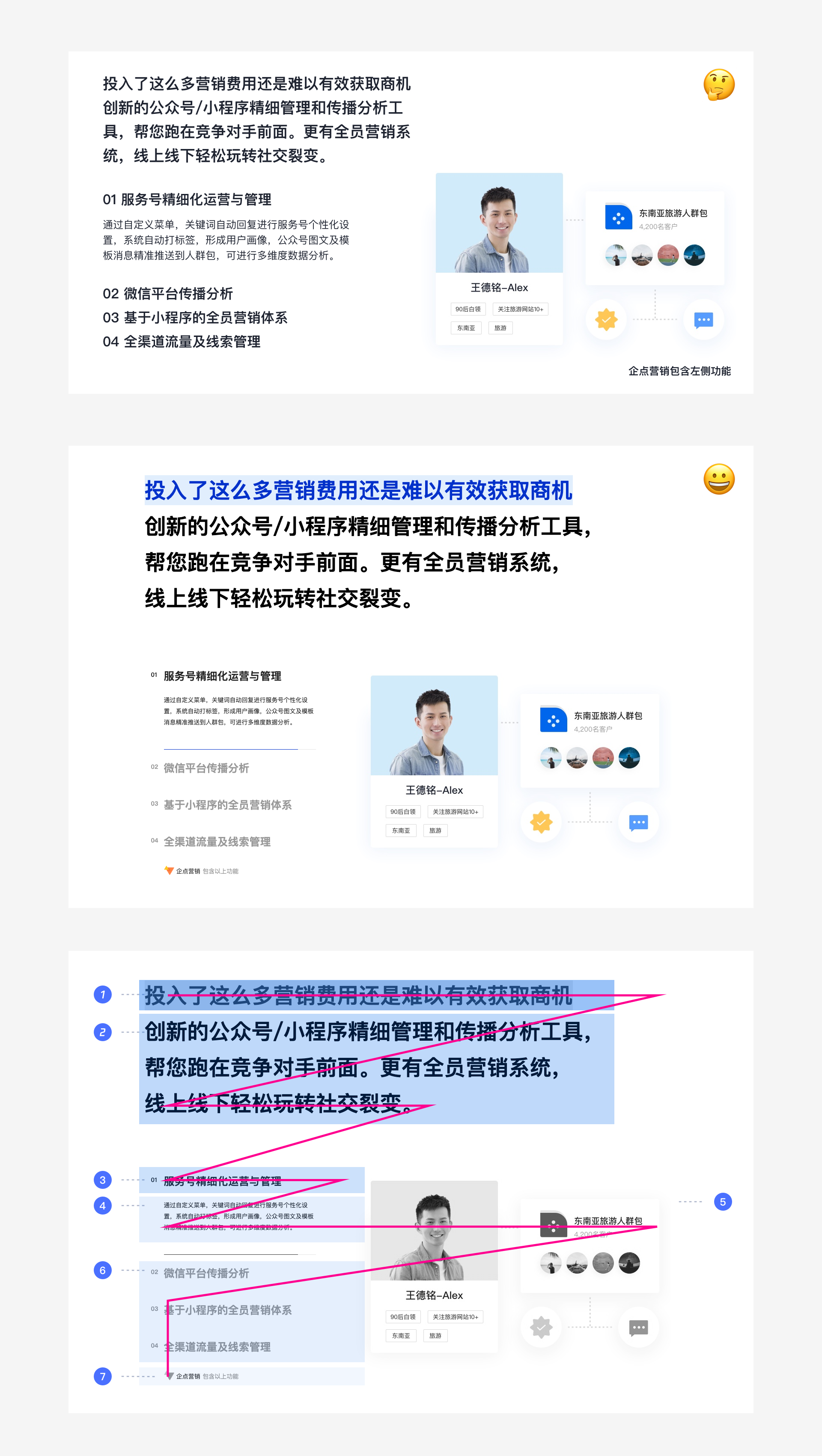 上圖就是企點3.0宣傳頁面中典型合理規劃文案結構的例子。用大號的段落文字區隔宣傳點,同時整段文字也依照“設問-作答”的結構做了視覺區分。在這一宣傳點下有四個子功能點,分別以“標題-描述-圖片”的結構引導用戶層層深入幫助理解。圖中的粉色折線模擬了用戶的瀏覽視線。