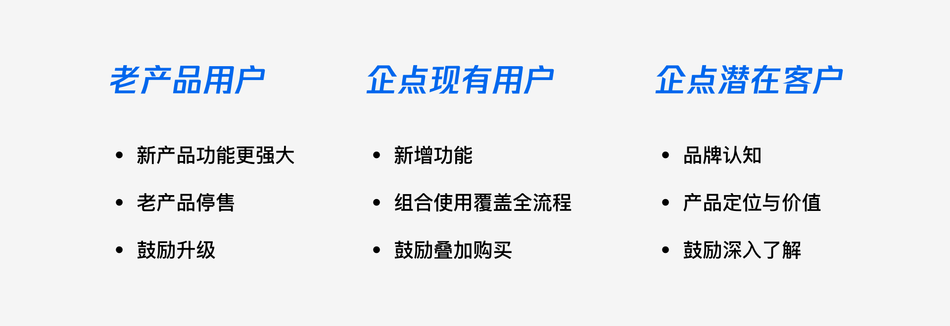 回到企點3.0宣傳頁,經過多方的共同商討,企點的潛在用戶作為最重要的受眾,現有用戶和老產品用戶次之。至此,加強品牌曝光,傳達騰訊企點全新定位,吸引潛在用戶深入了解,促進購買作為本次頁面最重要的宣傳目標。