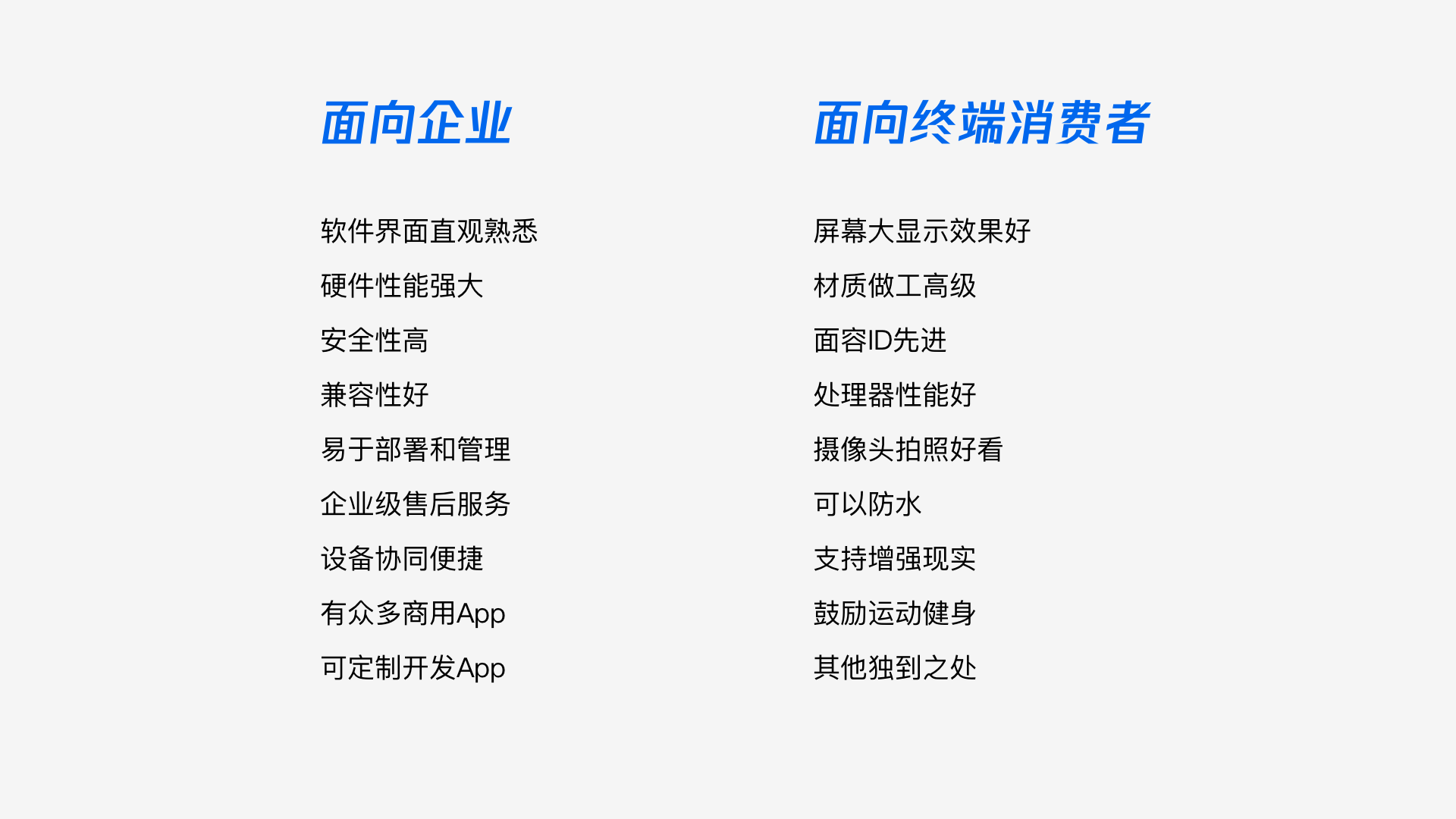還是以蘋果為例,商務-產品與平台https://www.apple.com/cn/business/products-platform/在介紹他們的消費級產品如何運用在商務活動中時,提出的賣點每一條都緊扣企業用戶最敏感的決策點(安全性、兼容性、擴展性、服務等);反觀toC向介紹各產品的頁面,則聚焦於產品本身,注重個體感受,打動終端消費者。
