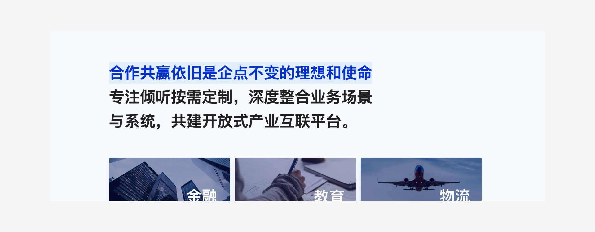 在宣傳頁面接近尾聲的時候,美好的理想和積極的價值觀非常適合作為總結,這裡我們巧妙地將“可集成、定制服務”等產品和服務能力昇華到理想和價值觀層面,開放、合作、共贏等關鍵詞也在潛移默化中增加著文案的驅動力。
