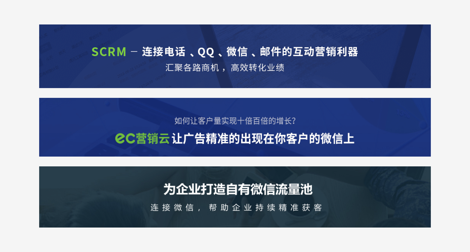 第二個案例來自EC https://scrm.com/ ,這是一款定位服務於中小企業的SCRM(社會化客戶關係管理)軟件,在其首頁的輪播圖中,我們可以看到這樣的文案: