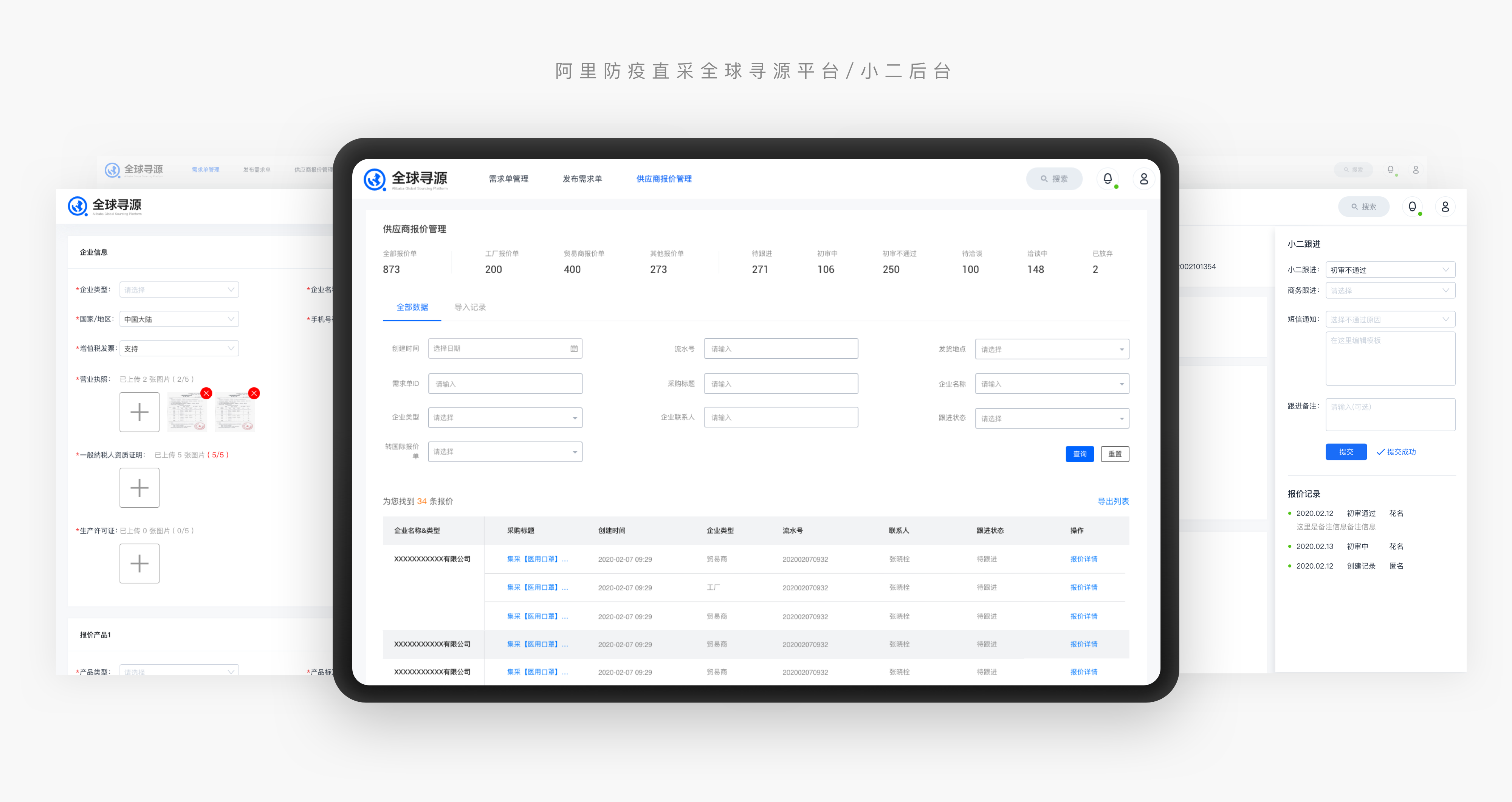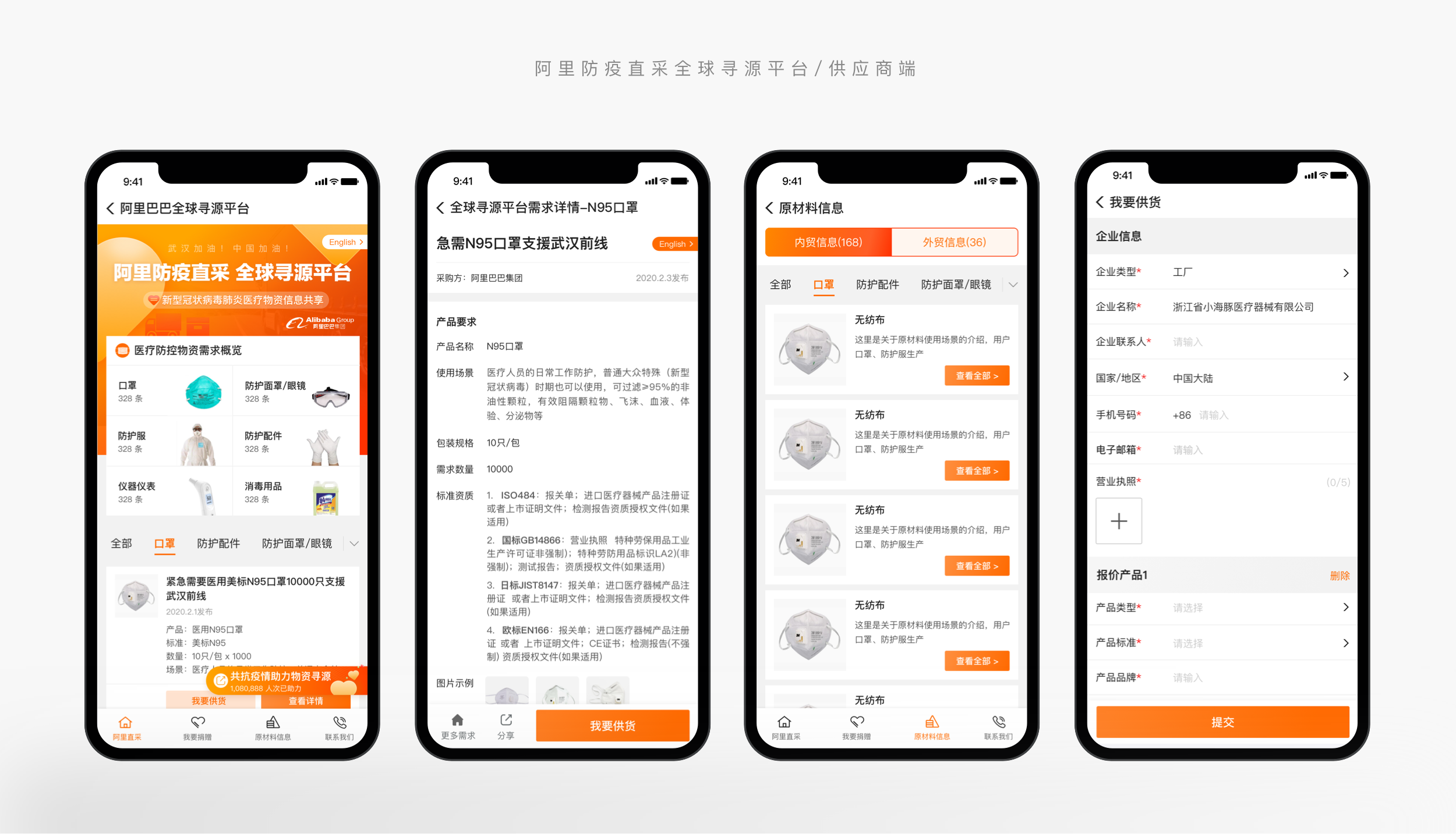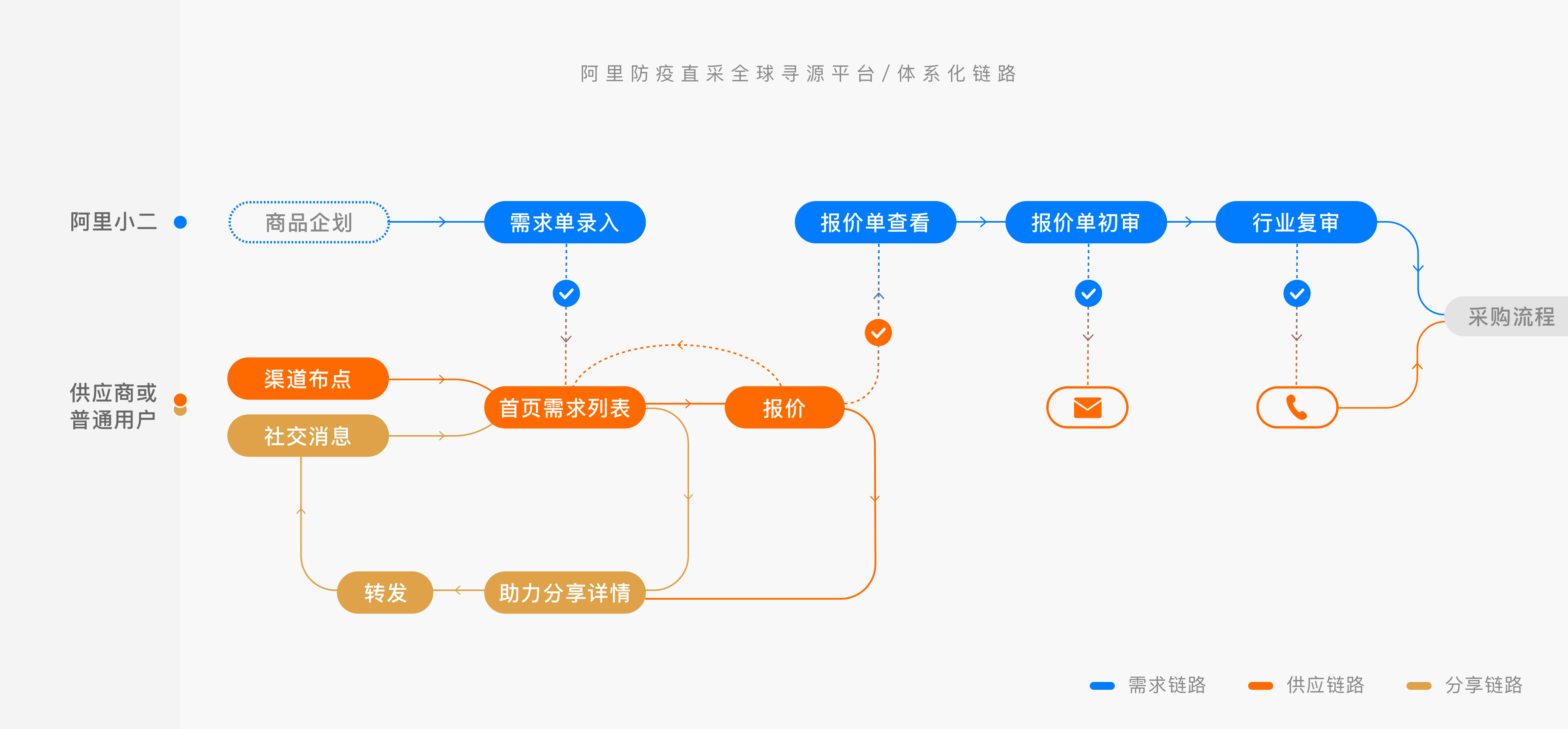 全球尋源平台在疫情期間主要針對防疫前線急需的醫療物資進行尋源,涉及到兩大類用戶,物資供應方-全球供應商,以及需求方-阿里小二;涉及供應商報價流程、小二需求發布&報價審核流程、普通用戶分享傳播流程;同時由於涉及到全球用戶,所有頁面需輸出中英文兩個版本。