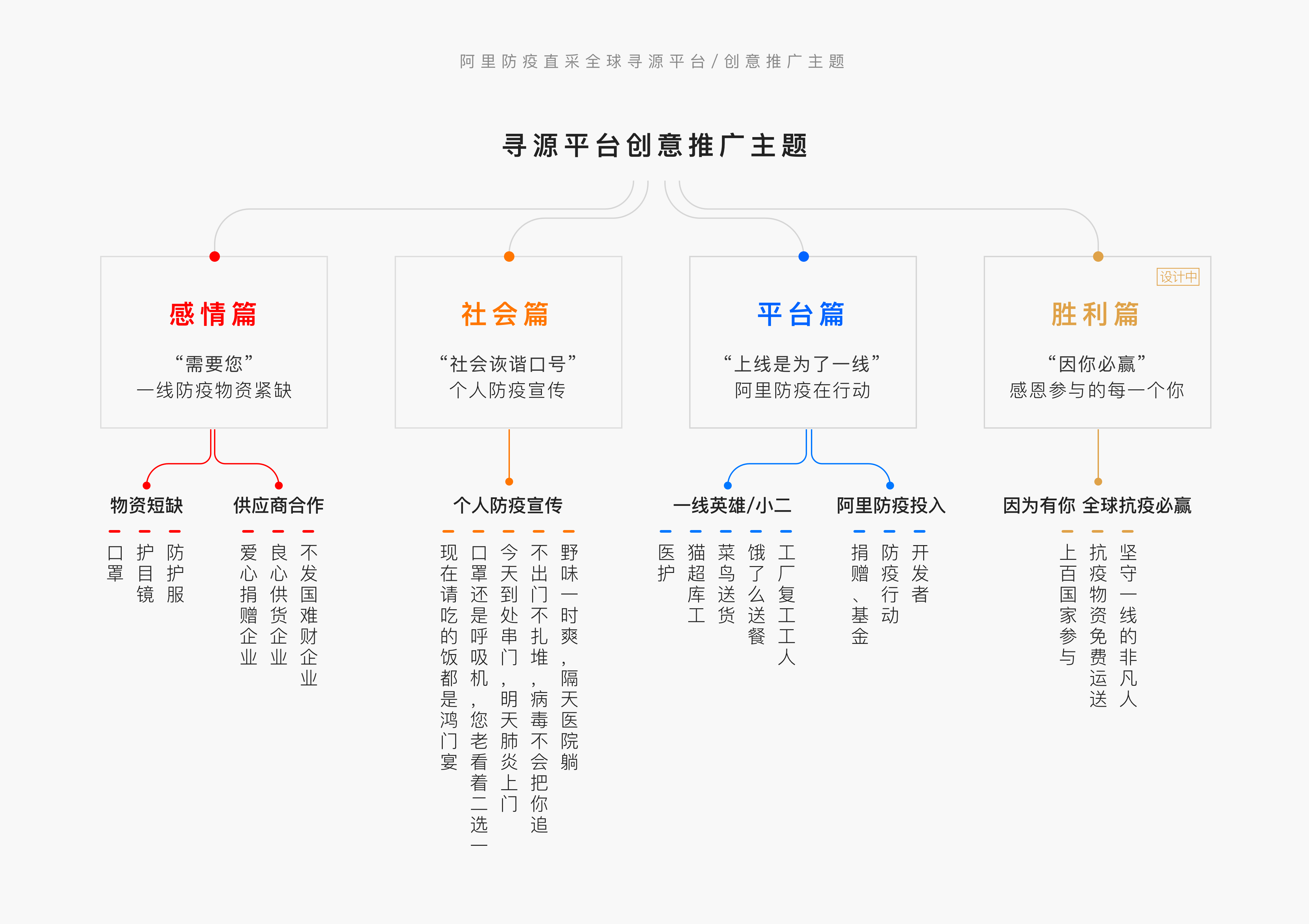 基於尋源公益平台的定位,我們需要表達出平台的社會影響力、客戶參與度及平台內部的投入。根據這幾個方面的思考,制定了三個傳播方向:社會篇、感情篇、平台篇。社會篇主要號召人人關注疫情,抗疫需要每一個人;感情篇主要體現一線物資緊缺,並表達對提供物資、捐贈商家的感謝;平台篇主要表達阿里小二們為抗疫的努力付出。然後通過內貿、外貿、淘寶心選、貓超、尋源等官方微博賬號進行推送,建立起平台與客戶、用戶之間的情感鏈接。