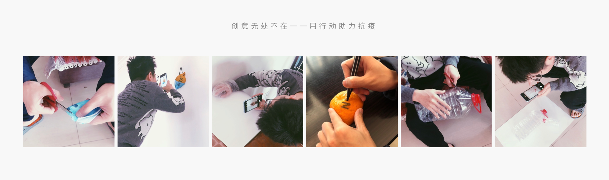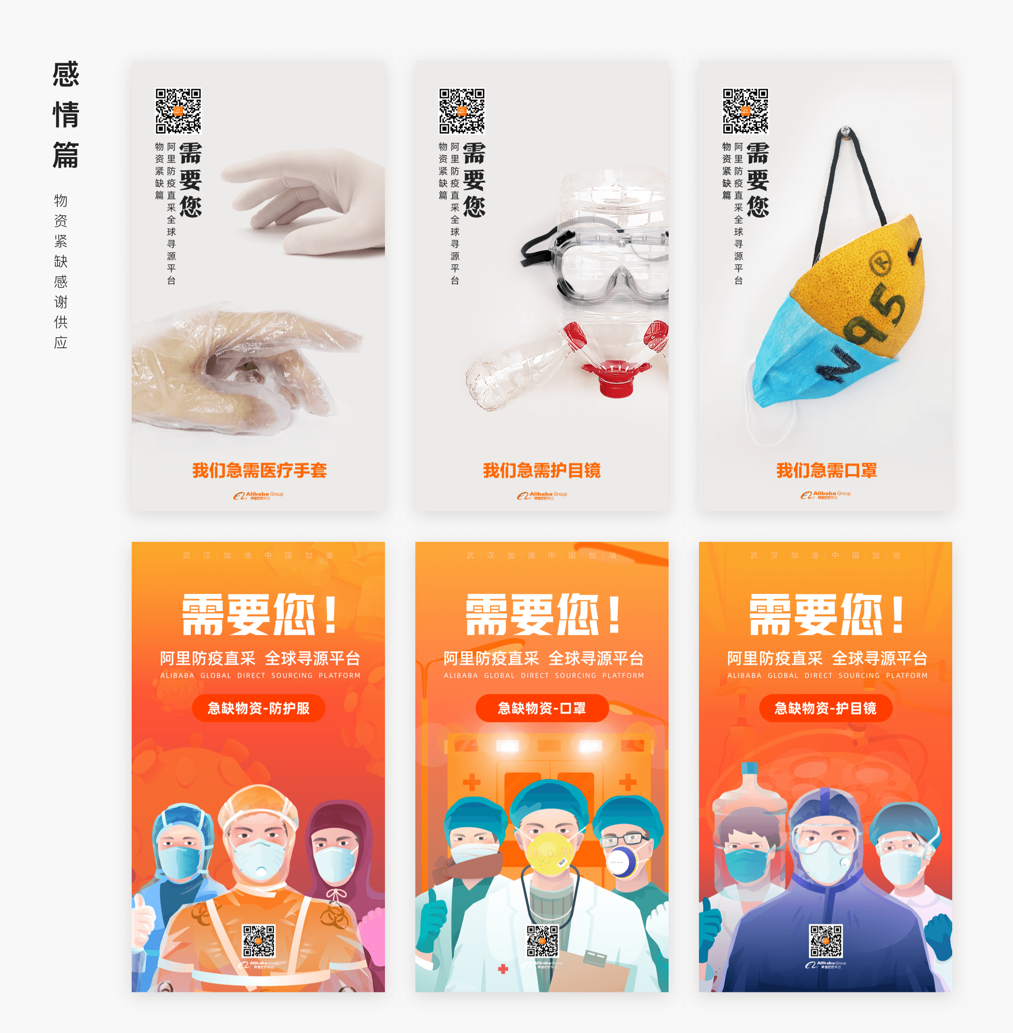 疫情期間設計師都是在家辦公,在素材緊缺的情況下,設計師發揮創意的力量,在家中製作設計素材。在感情篇中,為了凸顯物資的緊缺性,通過對比和誇張的手法,表達口罩、護目鏡、手套等物資的緊缺。每一張創意海報背後都有設計師對抗疫的專注和愛心,設計手法縱使有千種,抗疫的決心只有一個,在此也感謝參與抗疫尋源平台的所有設計師們。