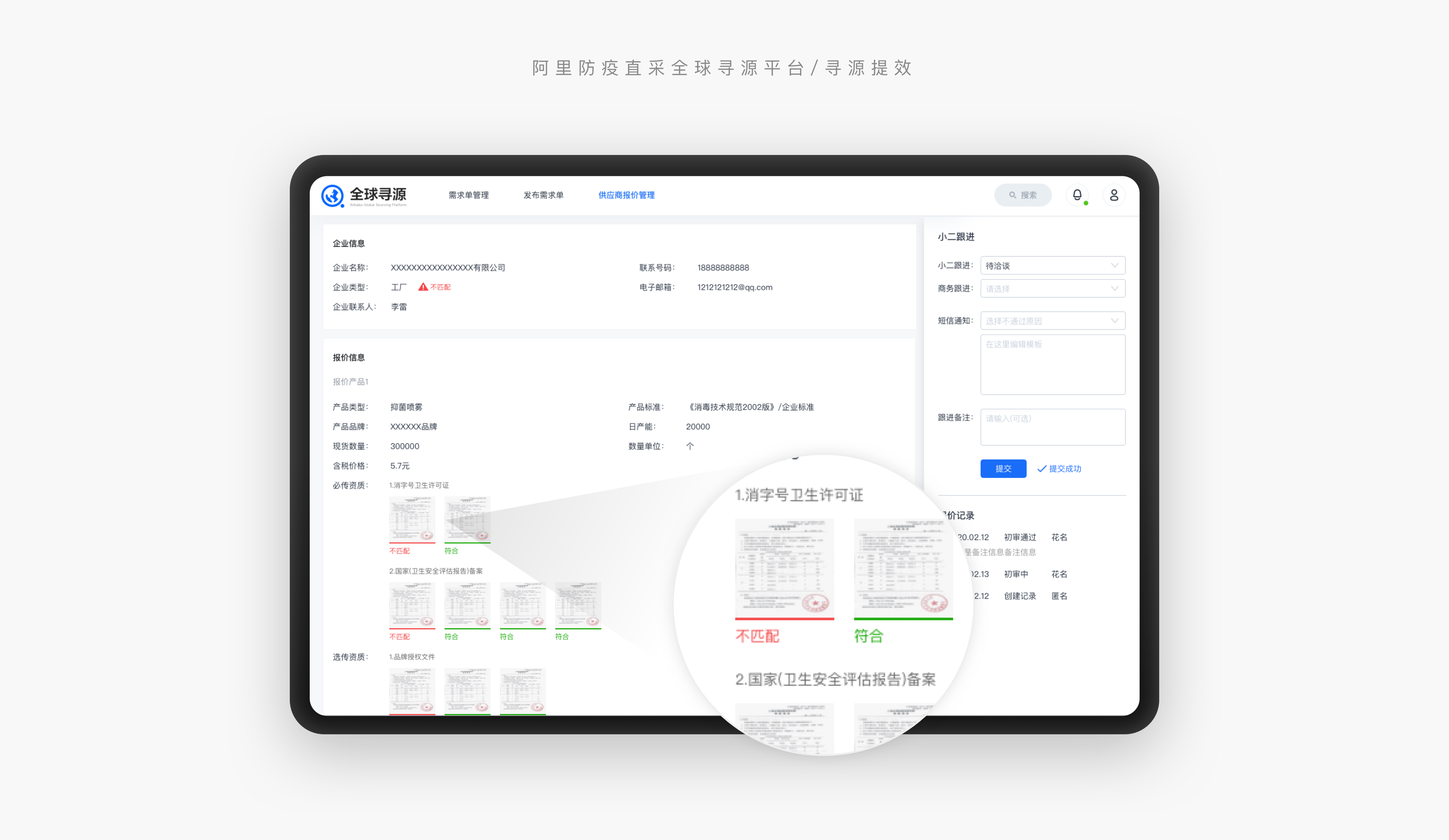 全球尋源平台上線後,收到大量來自全球的報價單,給小二初審環節帶來很大壓力,由於報價單中需審核的信息較複雜,尤其是不同類型產品資質圖片的校驗,初審小二需提前熟悉資質及要求,在審核過程中要識別每張圖片是什麼資質、再與標准進行人工比對,使得初審效率低成本大,供應商等待審核時間長。為提升初審效率,我們除了優化頁面易用性及操作流程外,還引入了一些中台能力為審核提效。通過圖片識別能力,自動校對產品資質圖片,調用集團Onecompany企業數據庫,自動與報價單中的企業信息比對,並將校對結果以可視化形式展示,提升初審中的校驗效率;智能外呼及驗資短信,可在報價單的審核狀態發生變化時,自動向相關供應商發送短信或電話通知,省去了由於供應商資質不全需要電話溝通的環節,供應商也可以在第一時間了解報價單的審核進度。