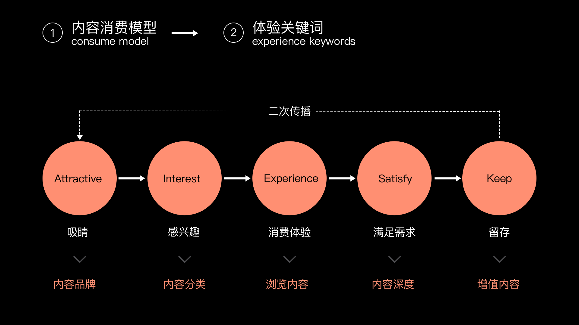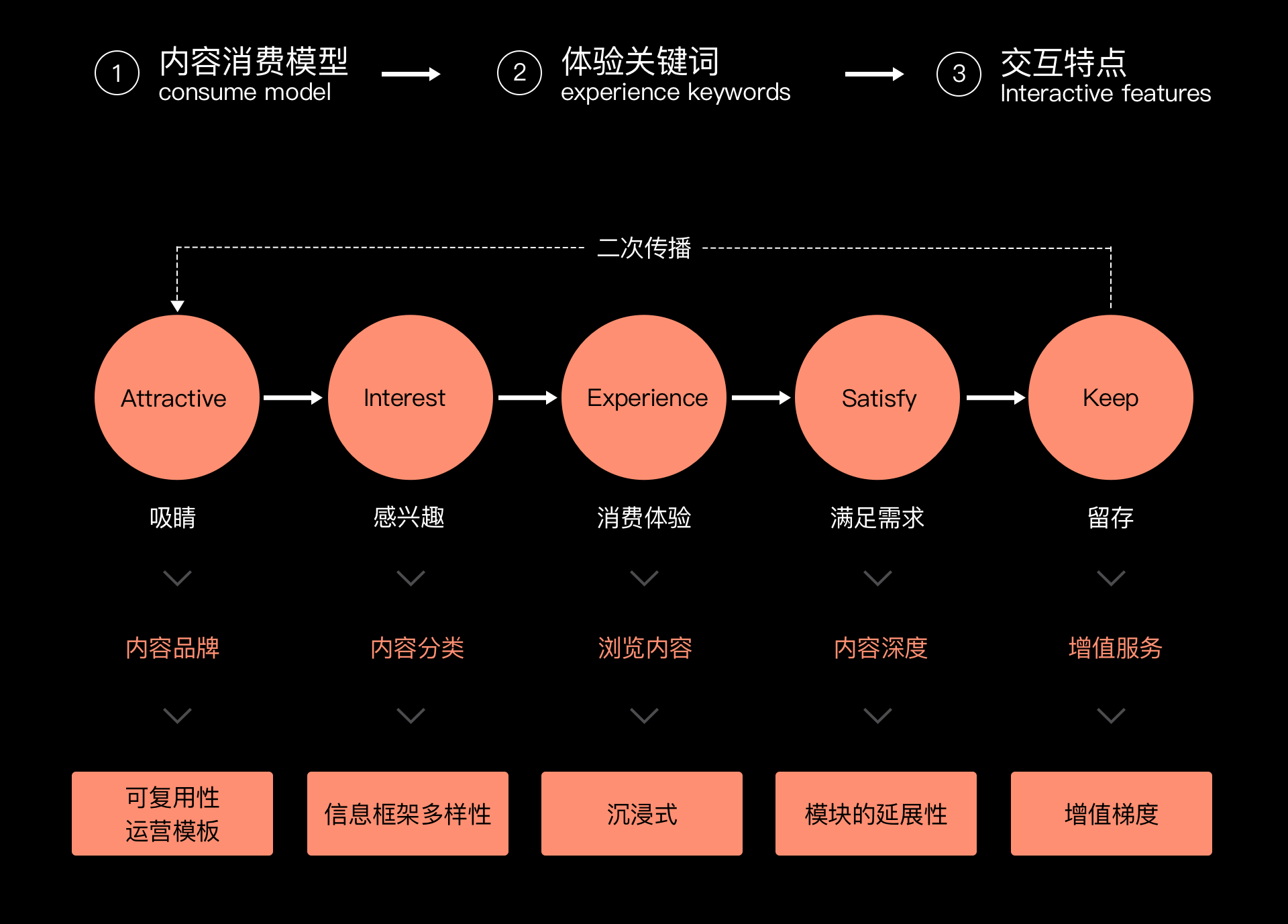 交互規範需根據產品屬性來製定搭建策略以及規範規則。那內容型產品應該如果搭建交互規範呢?首先要根據內容型產品的用戶消費模型來劃定交互規範的流程範圍以及關鍵節點。模型分為:1 吸睛;2 感興趣;3 消費體驗;4 滿足需求;5 留存。轉化成深度用戶再進行二次傳播後,通過關係鏈給產品拉新。