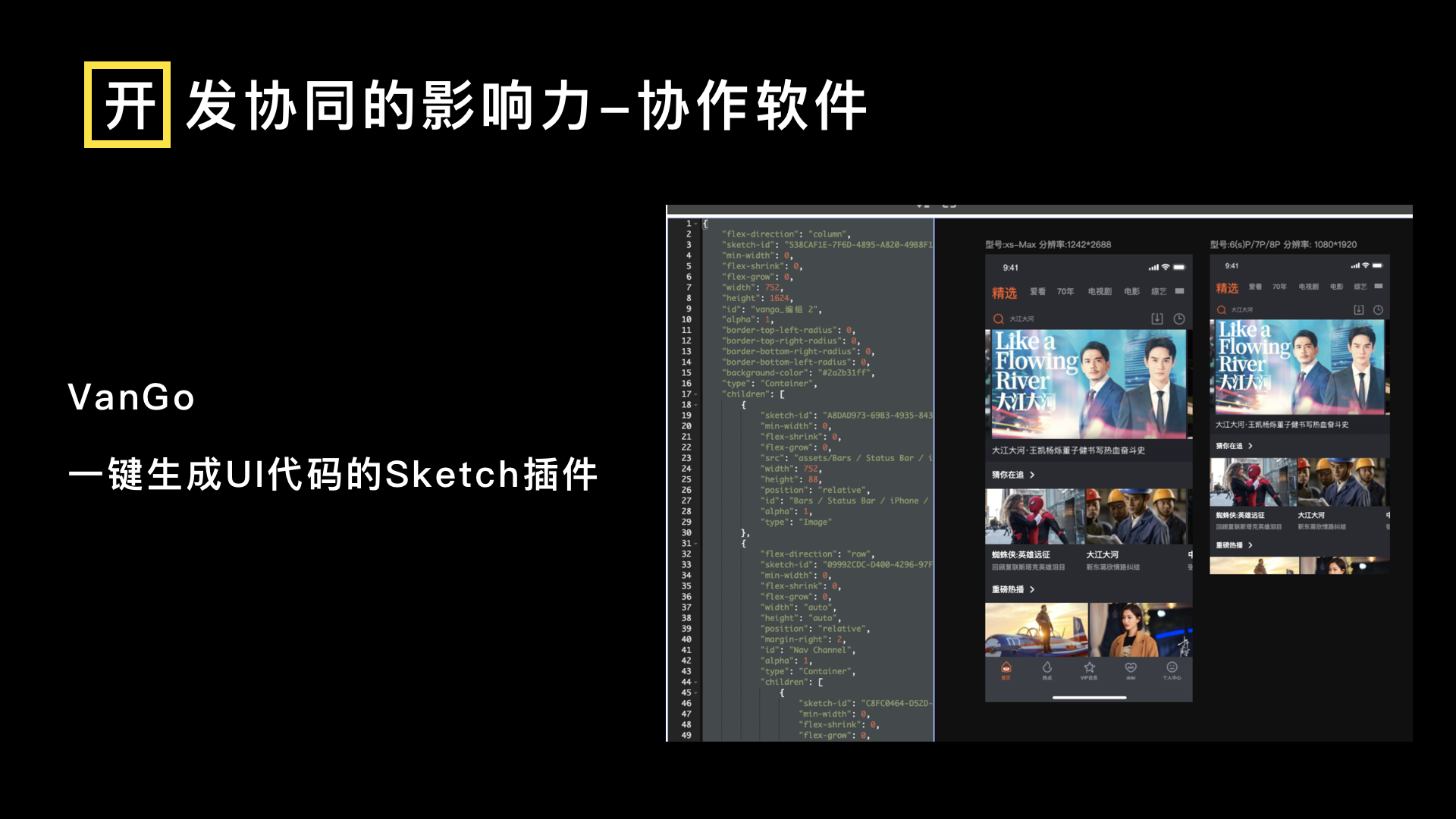 設計規範向外發揮用途,著重於與開發團隊協同合作。具體實現流程,以VanGo(梵高)組件為例,該開發組件是騰訊視頻的開源的一個高效的跨平台的渲染框架。 (有幸參與到動漫業務部的宣講會議),它可以改變視覺標註信息的視覺稿,客戶端開發同學代碼實現,再到設計走查還原這種傳統低效的流程模式。使用VanGo框架提供的Sketch插件可以直接對設計稿生成JSON格式的文件。客戶端通過框架解析文件可以直接顯示出UI。這樣子可以很大程度上減少視覺還原的工作和減少開發的工作了。大大提高了設計時間效率,讓設計師專注於UI深度的挖掘。