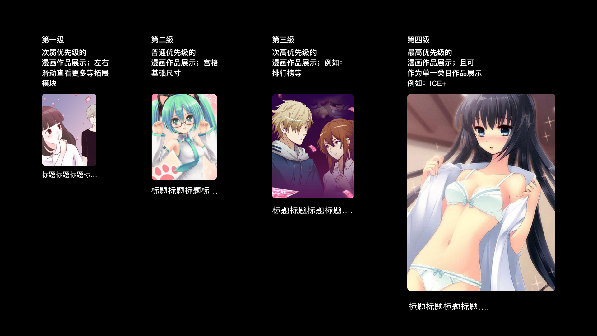 作品封面在不同頁面上都有不同的尺寸,不同比例;但多種模塊尺寸又是業務訴求,那怎麼辦?交互需要先去理解業務內容,深入到產品邏輯層面去尋找“相似性”。從而找准交互規範中的“狀態”規則。根據業務類型劃分封面的使用場景,不同場景內再以優先級展示的維度,劃定在不同比例中可複用的固定尺寸。在同一層級內,刪除無差異性的尺寸。未來業務發展可參照不同優先級來選擇設計模塊。這樣才能做出可延展的設計規範。