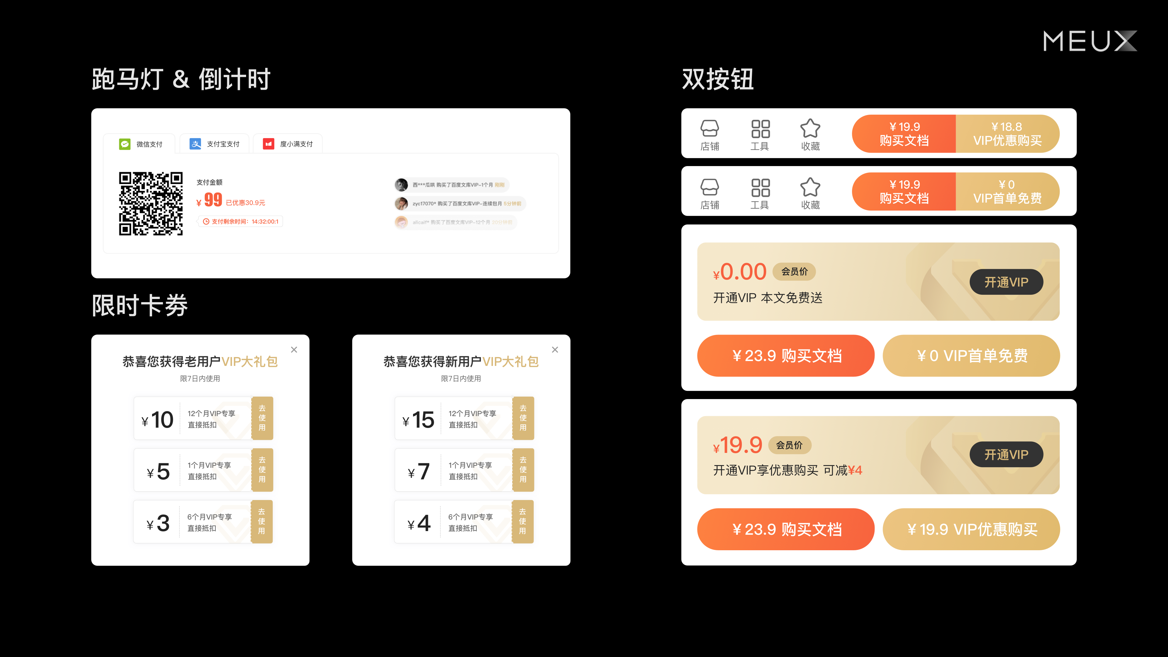 本項目中參考八角模型核心驅動力5社交、6稀缺、8虧損,進行瞭如下的設計:1)跑馬燈;2)雙按鈕價格對比;3)倒計時/限時卡券。