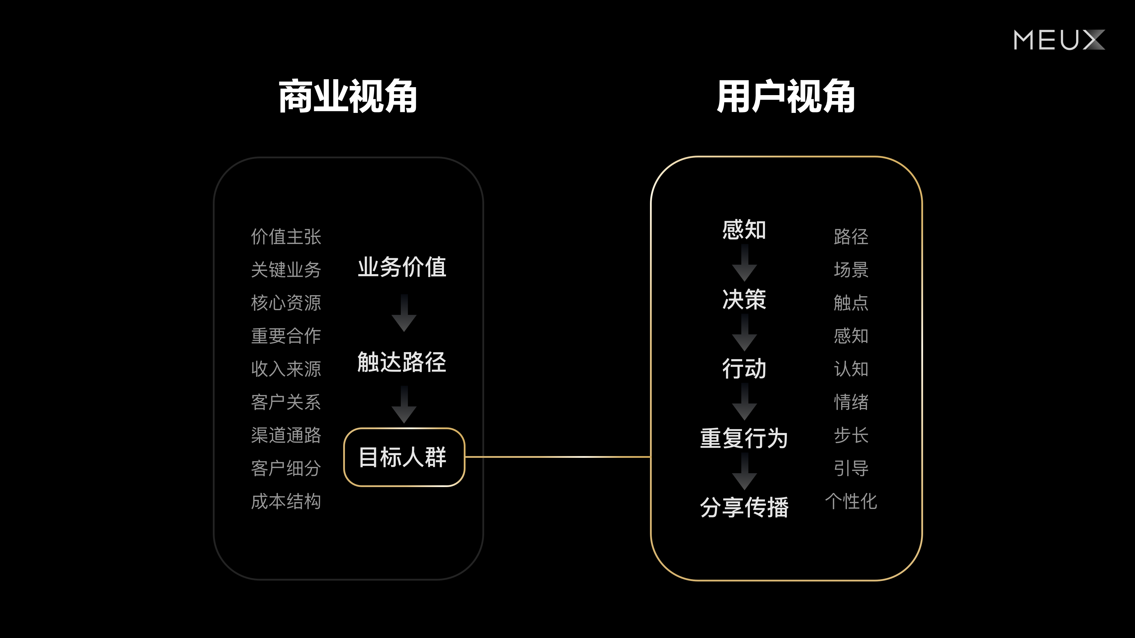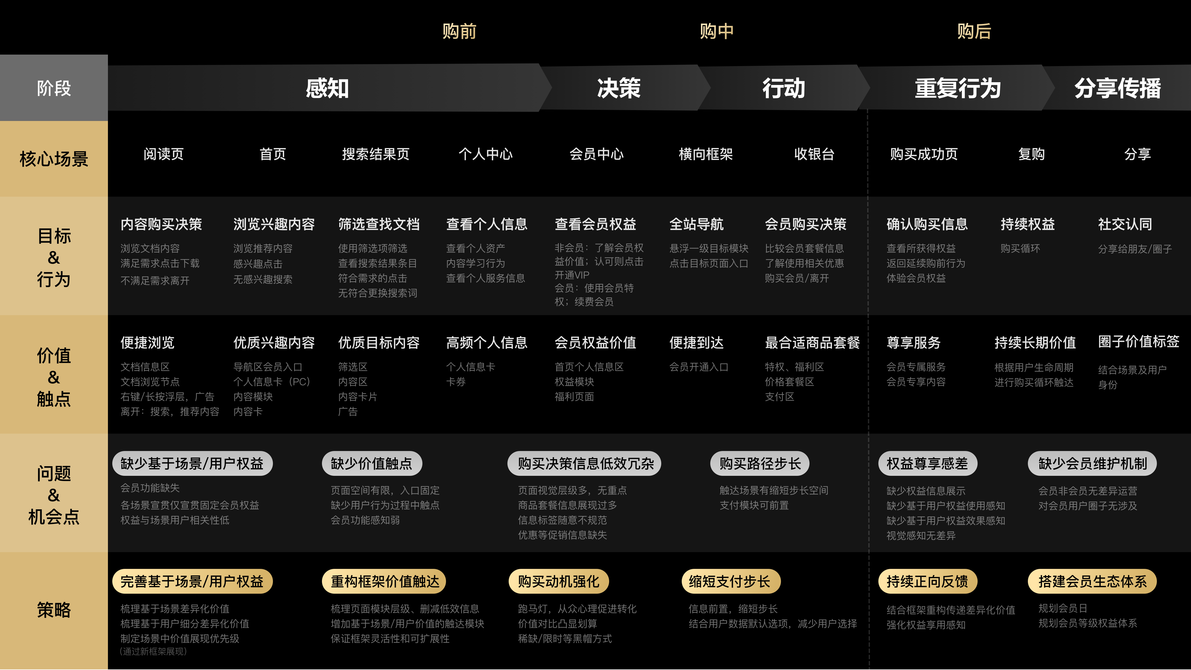 從宏觀商業視角,我們梳理了產品價值體系增值方向、價值傳遞通路觸達方案以及業務目標人群細分體系,如何讓新的系統發揮作用呢?我們通過微觀的用戶視角將上述價值落地。