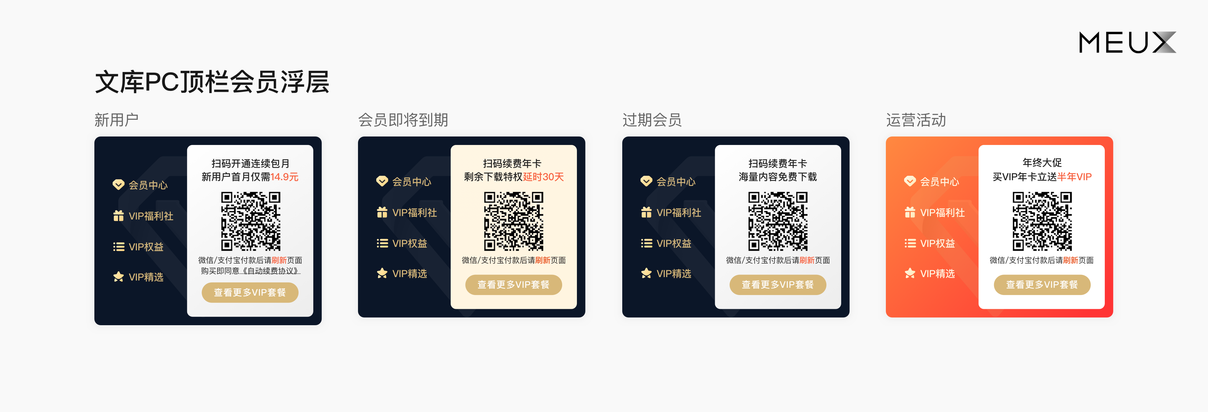 同樣,在閱讀頁也根據有限頁面空間進行了重新規劃:在頭部區域增加會員卡片,傳遞核心轉化信息。此處同時考慮到後續相關商品優惠信息的展示擴展性問題,梳理了不同文檔類型、活動類型、折扣類型的互斥關係,共用一個區域進行擴展,保證最核心轉化信息觸達,避免過多信息干擾用戶決策;而在用戶瀏覽過程中,採用漸進式引導的方式,隨著閱讀的深入分層展現會員轉化信息,在閱讀過程節點進行強形式展現,促進購買轉化。