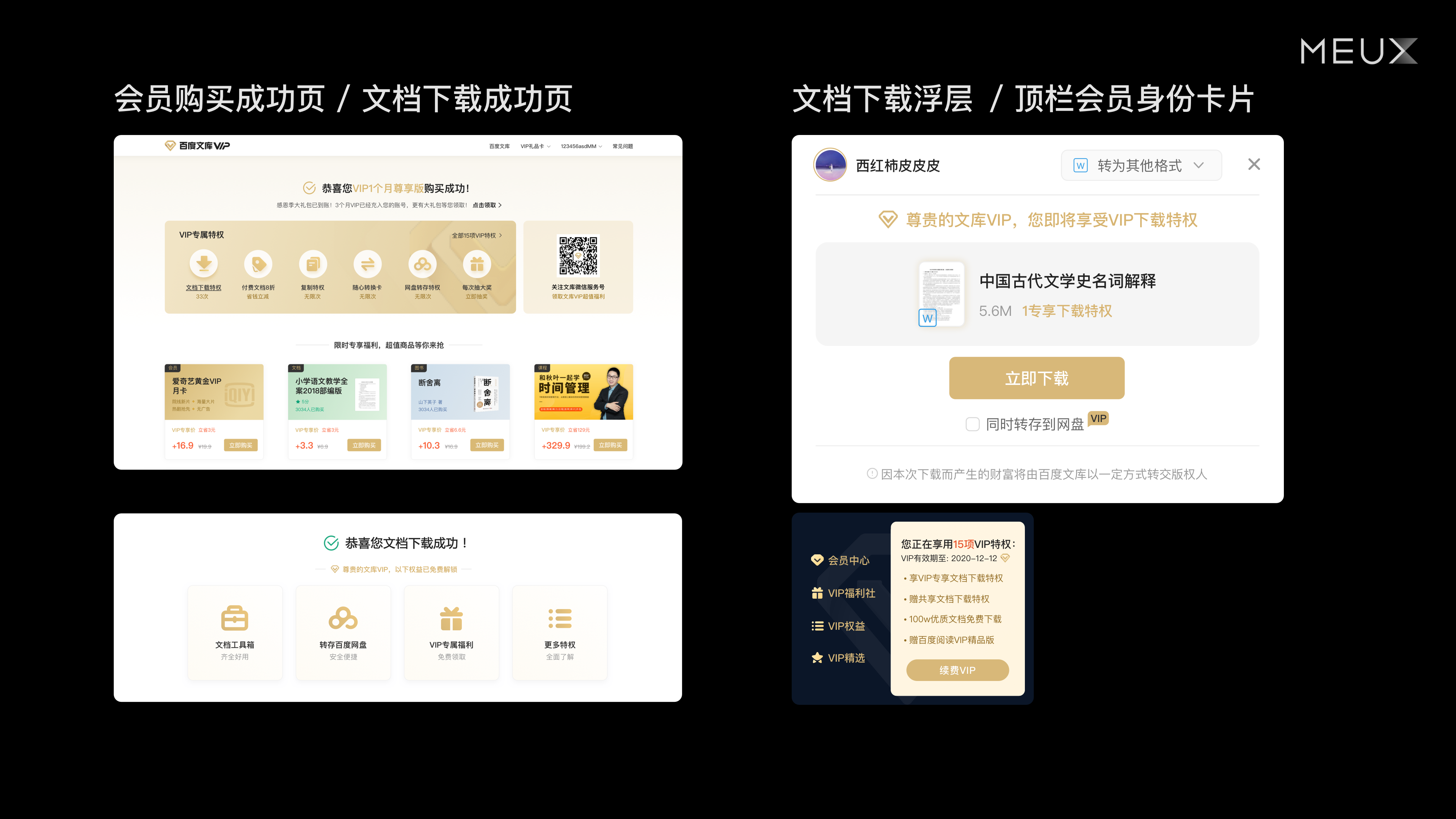 在用戶成為會員節點,宣貫會員特權,突出獲取感,引導即時體驗特權;在日常使用中,針對特權享用場景進行感知強化,凸顯尊享感,如在會員優惠文檔信息區展現會員價標籤,在文檔下載節點過程中顯示正在使用特權,在各場景身份卡顯示正在享用特權;以及持續擴充會員服務價值體系,如閱讀頁換膚、移動端專屬開屏等。