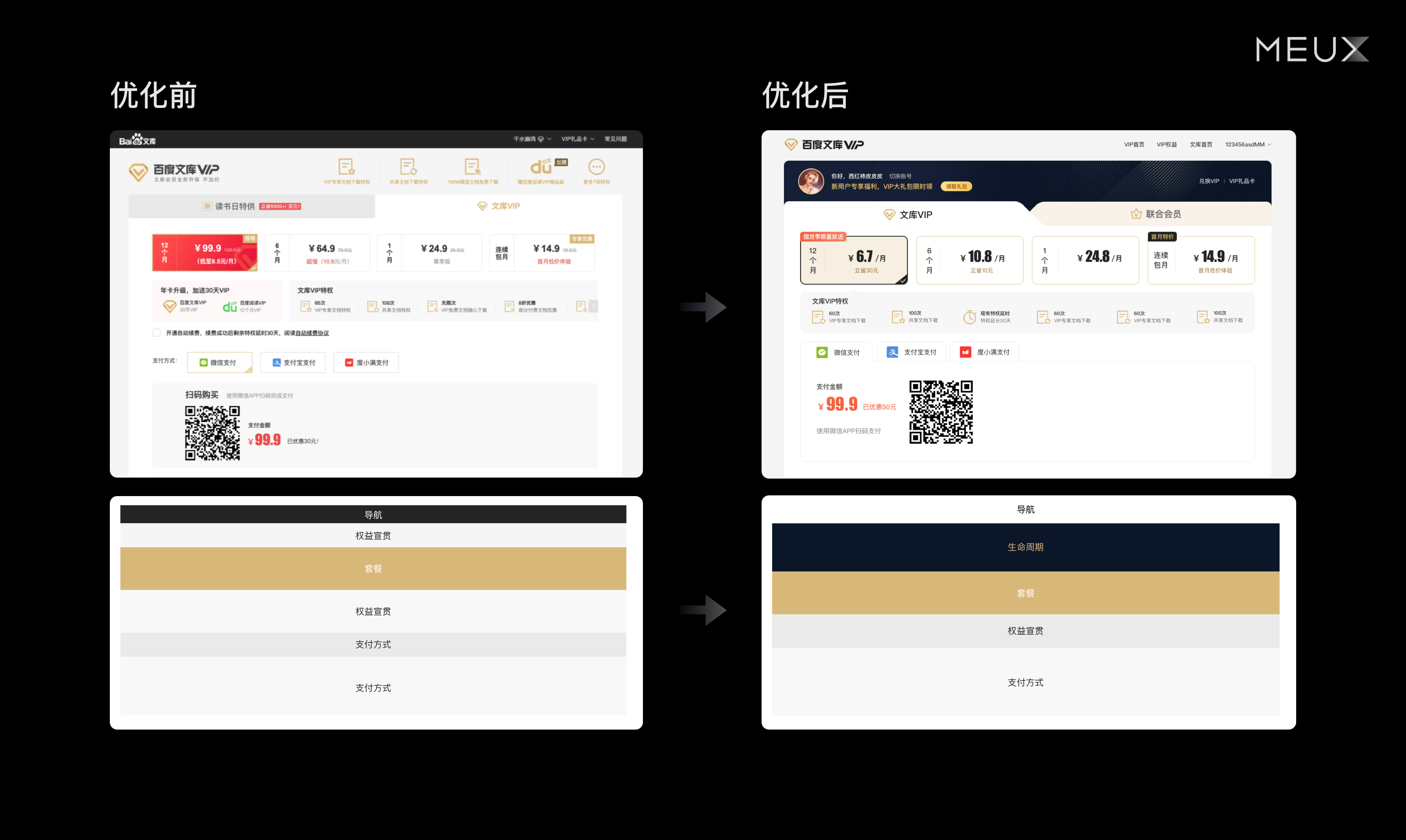 以PC會員收銀台為例,優化前的收銀台在模塊上存在權益宣貫區重複、信息區隔瑣碎的問題,使套餐的選擇和支付行為受權益宣貫信息影響,核心價值不夠凸顯。針對這些問題,對結構的信息權重進行重新梳理:將導航與背景融合,縮減信息區塊同時強化會員品牌感;增加價值傳遞卡片,承載核心轉化價值點;將權益宣貫模塊進行整合弱化,作為商品套餐決策的輔助信息;合併支付方式區塊,降低信息區塊數量的同時增加支付方式和支付信息的關聯性。