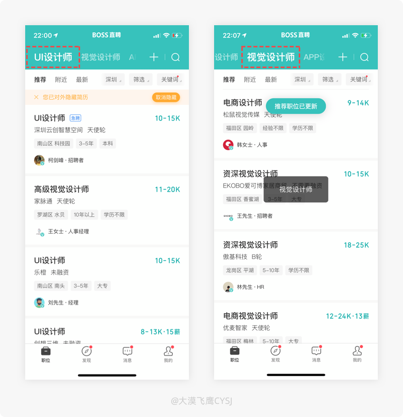 Boss直聘APP在tab欄成功切換頁面後,除了有清晰反饋操作結果“推薦職位已更新”之外,還在屏幕中間用另一個更加顯眼的toast彈出明確職位信息。其實用戶在切換tab欄時,此操作行為不僅僅是切換頁面,所對應的類型才是首當其衝,當明確類型無誤後才會將思維轉向內容,職位彈窗在屏幕中心提示,佔據有利地形,除了讓用戶清楚當前頁面交互狀態之外,還能快速感知類型是否為自己所需。另外還有防錯作用,避免用戶操作失誤後,在自己還不清楚的情況下去瀏覽內容而浪費大量的時間。
