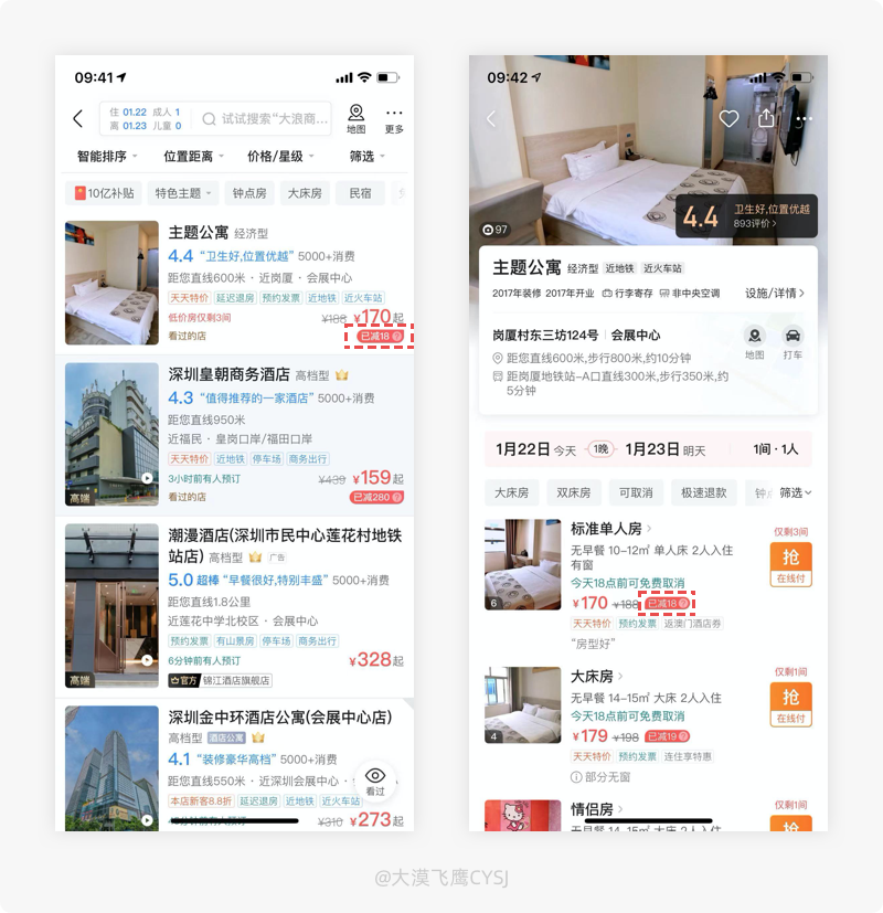 在美團的酒店列表價格區域,除了有劃掉的原價和優惠之後的價格外,還特別突出展示了優惠的實際金額,非常顯眼,以彰顯其優惠的力度。