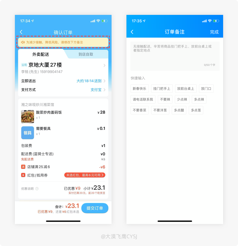 在餓了麼確認訂單頁面,為了有效的控制疫情傳播,頂部會提示“為了減少接觸,降低風險,請修改下方備註”,進入備註頁面,輸入框的佔位符和快捷輸入都優先展示避免接觸取餐的方法參考。