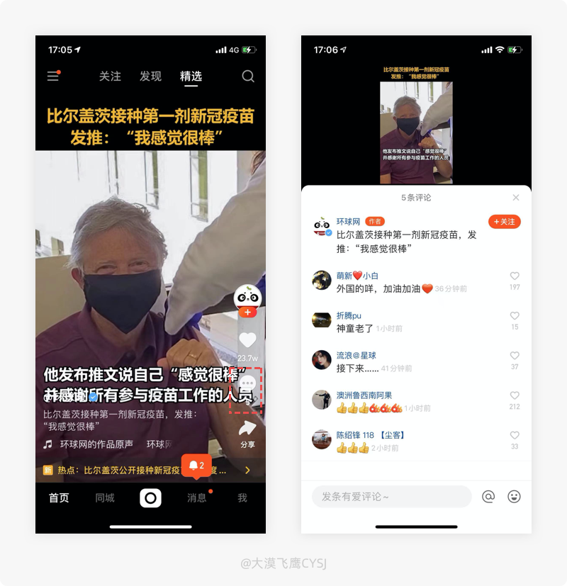 在快手APP看短視頻,無論是編輯還是瀏覽評論都可以齊頭並進。觸發評論後,頁面從底部向上彈出,視頻的頁面佔比範圍會以播放狀態等比例縮小並置頂,類似我們在看電影時的橫屏和豎屏,視頻觀看及評論兩不誤。這種交互方式在滿足用戶下一個需求時,並不中斷上一步的需求,避免原本看視頻的思路被打斷,有助於用戶跟隨視頻播放的思路即興發揮評論,這也是一個容易設計師被忽視的好功能。