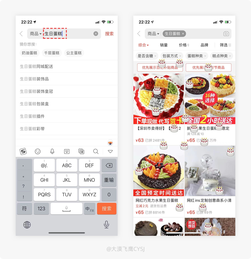 在拼多多搜索“生日蛋糕”時,商品搜索結果呈現的同時,會有滿屏的蛋糕表情落下,以示祝福。