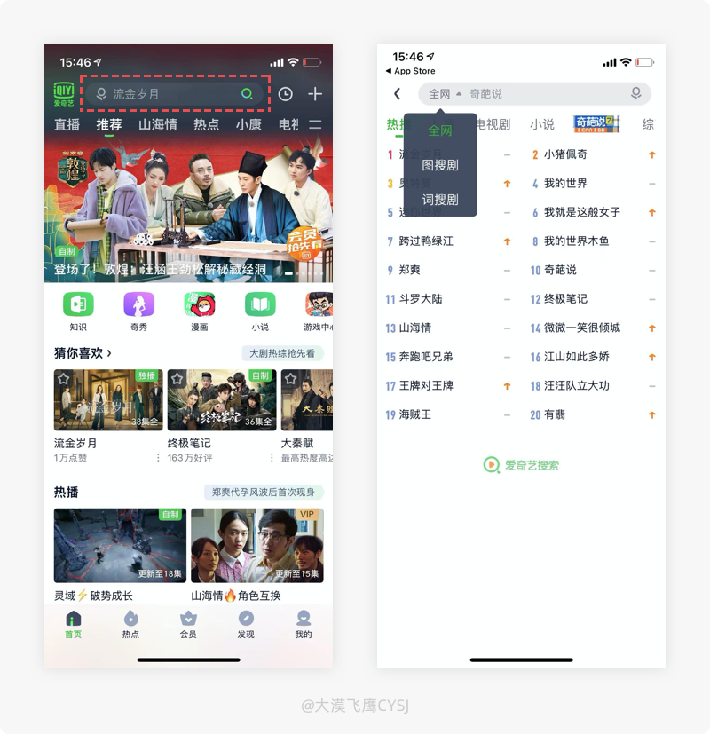 愛奇藝APP在搜索功能中進行了分類,比起常見的全局搜索其結果更加精準,通過全網、圖搜或詞搜類型改變搜索範圍,便於用戶在最短的時間內找到自己想要的結果。可以想像,當我們在百度查找需要的內容時,面對幾萬乃至幾十萬的結果匹配時,翻過幾頁後,要么放棄、要么換掉關鍵詞。愛奇藝的分類型搜索縮小了查找範圍,降低用戶的時間成本,還能提高對用戶的信任度,以增加其使用粘性。