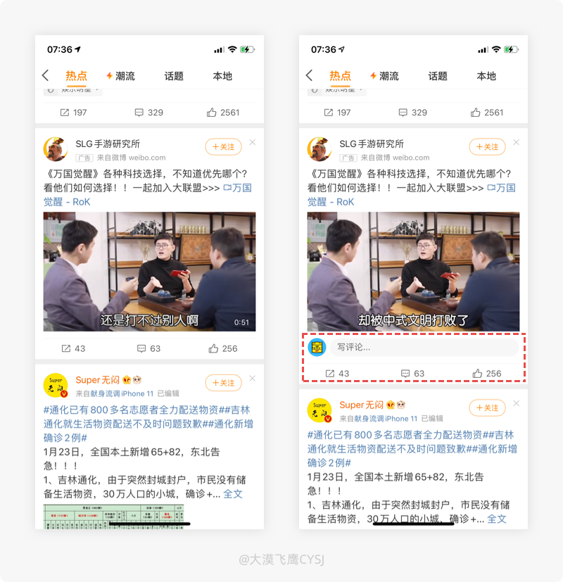 當我們在微博列表中的某條信息處停留5秒並無任何操作時,此條微博下方會自動彈出評論框,系統通過行為預判感知用戶對該內容感興趣,引導用戶去發表自己的想法。