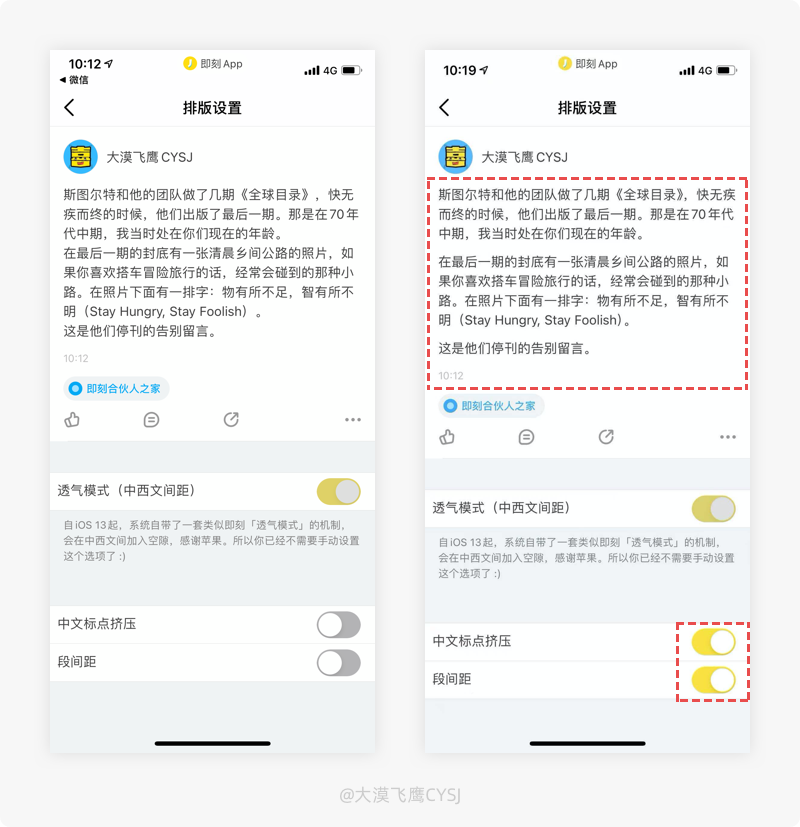 在即刻APP的排版設置裡,開啟“中文標點擠壓”和“段間距”,文本內容會自動減小中文符號後面的間距,且段與段之間也會增加留白,提高視覺舒適度。