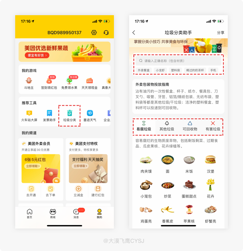 美團我的頁面,推薦工具的“垃圾分類”功能,能幫助我們進行識別因外賣產出的垃圾類型,便於跟線下對應的垃圾桶“對號入座”,減少不必要的垃圾混合而增加清潔工人的工作量。