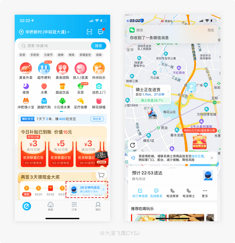 如果在餓了麼有訂單存在,再次進入首頁,右下角會提示配送信息,點擊直接進入查看詳情。從表面上看,右下角的入口雖然提供了快捷通道,但似乎不太友好,總是會遮擋部分內容。其實並非如此,是因產品根據用戶的使用場景進行行為預判而設計的快捷入口,在正常情況下,從下單到完結一般在30分鐘左右,如果用戶存在未完結訂單且在短時間內再次進入平台,80%以上的用戶此時需求為查詢配送進度,因此,右下角的進度提示正是在合適的時間給予用戶合適的提醒,根據用戶的場景需求提供了最為便捷的解決方案,由此可見、利大於弊。