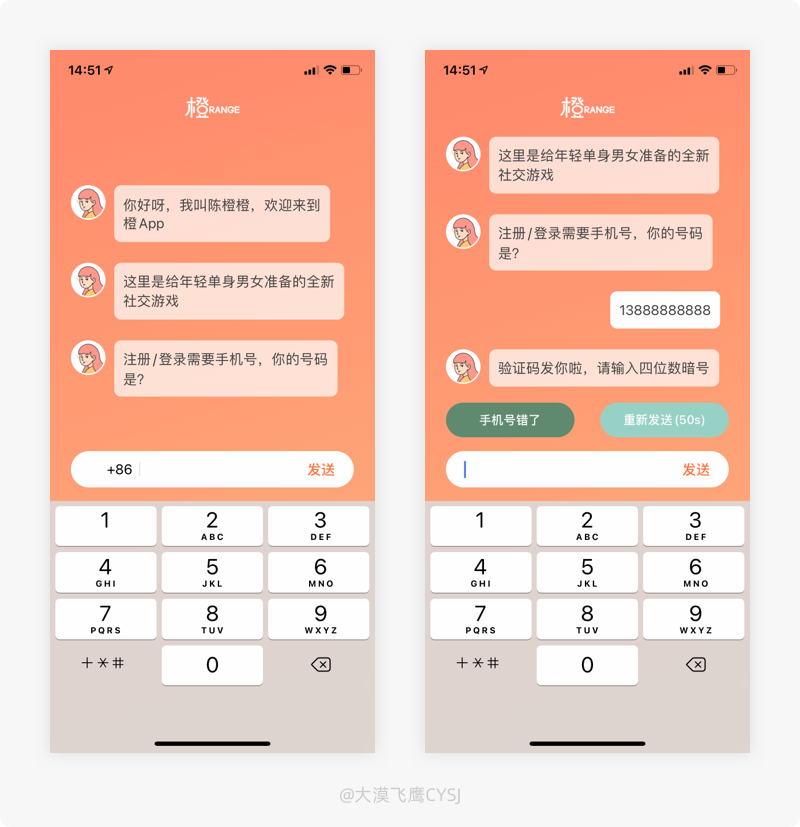 橙APP的登錄方式雖然同樣是手機號+驗證碼登錄,但在流程樣式上卻非常新穎。鑑於應用本身屬於社交行業,通過對話詢問的方式讓用戶按照流程輸入了手機號和驗證碼,給用戶造成這不是對使用該APP設置門檻的錯覺,降低用戶的防備心理(很多產品用戶量的增長都被擋在了登錄之門外),讓用戶不知不覺在聊天過程中完成了登錄流程操作,其方式非常友好且登錄的過程是愉快的,同時還兼帶了濃濃的社交行業屬性,通過更直觀的登錄場景感受,拉近用戶跟產品之間的距離,使用戶的印象更加深刻。