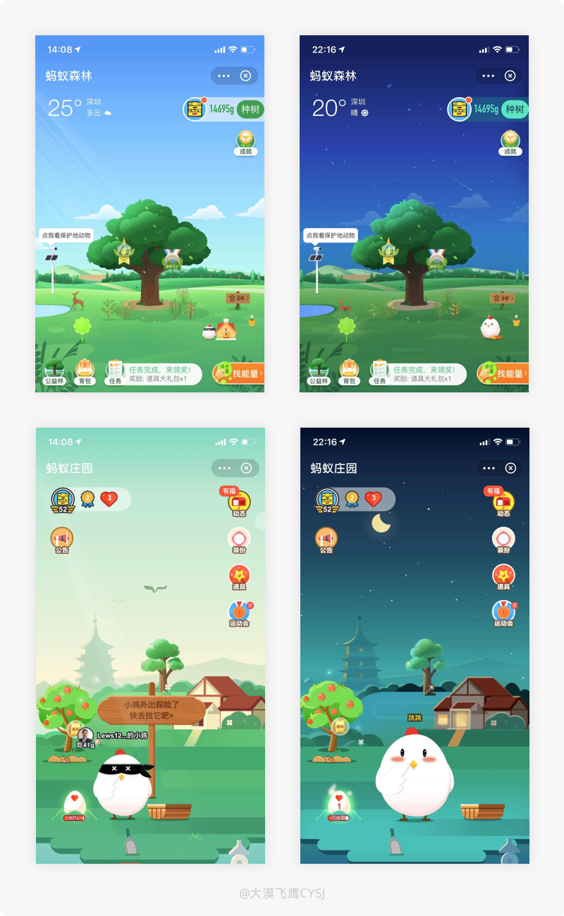 螞蟻森林/莊園的視覺場景跟隨著白天、夜晚的環境變化,產品遵循現實世界慣例來呈現信息,更具真實感,便於用戶在使用中將現實中的體驗不經意間帶入到遊戲場景,可使其更加投入,通過用戶的現有認知,以促成情感化的體驗,使產品更具親和力。
