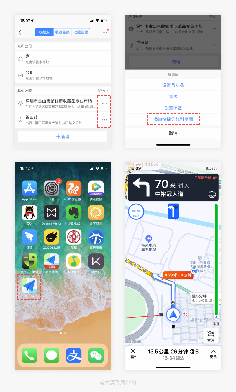 通過高德地圖的收藏夾,點擊收藏地址右側的功能菜單,在彈窗中將該地址“添加快捷導航到桌面”,後續就不用每次輸入常用的目的地了,直接通過桌面的圖標入口即可一鍵導航。