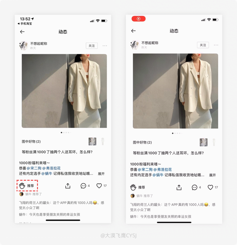 推薦是對其事件/事務認可的一種表達行為,最早可追溯到上古時代的堯舜禹時期,那時候如果對某件事或人,高度認可時就使用鼓掌(慢速且有節奏)的方式來表達;到後面慢慢演變成了簡單的一個字“彩”;再到如今皆可用鼓掌、豎大拇指或直接言語...表達。基於互聯網的發達,為了讓更多人發現其內容資源的優質性,80%以上直接沿用了豎大拇指樣式來表達對內容的認可及讚許,即使有區別於其他產品,也是在局部或動效樣式上做出一點改變。