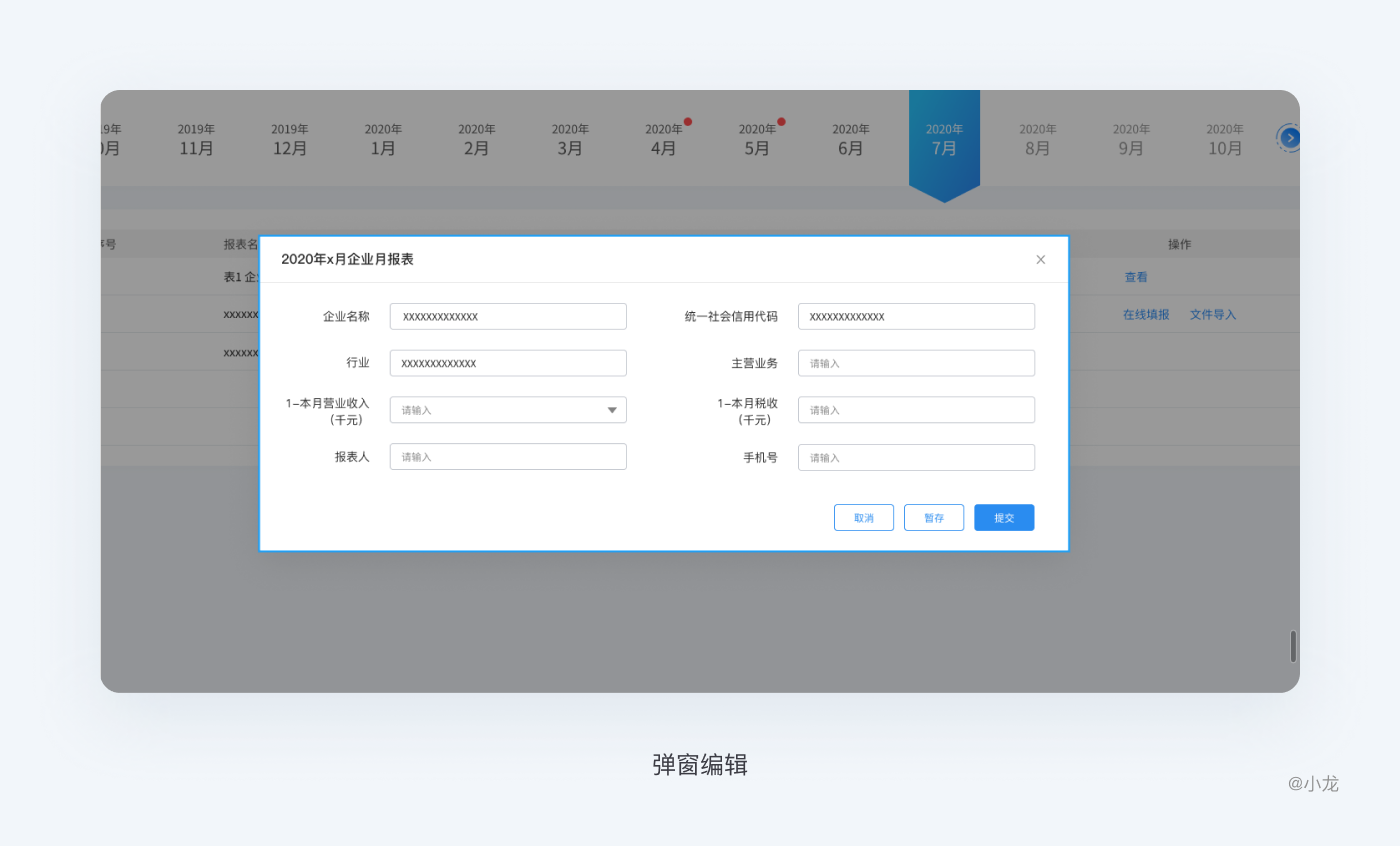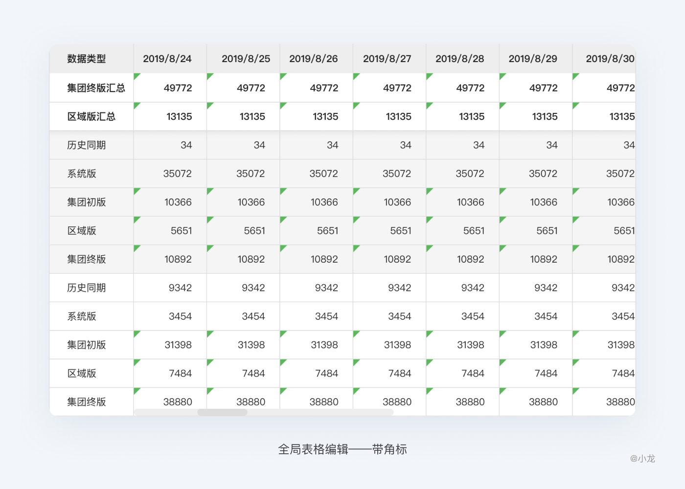 全局表格編輯:點擊表格編輯按鈕,當前表格所有可編輯的數據單元格內顯示文本修改框或類似XLSX的角標,進入一種特殊得編輯狀態,不會給人直覺造成混亂。這一功能基本用於大面積需要填寫和修改時,如大型填寫報表。