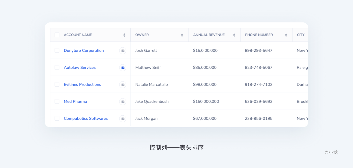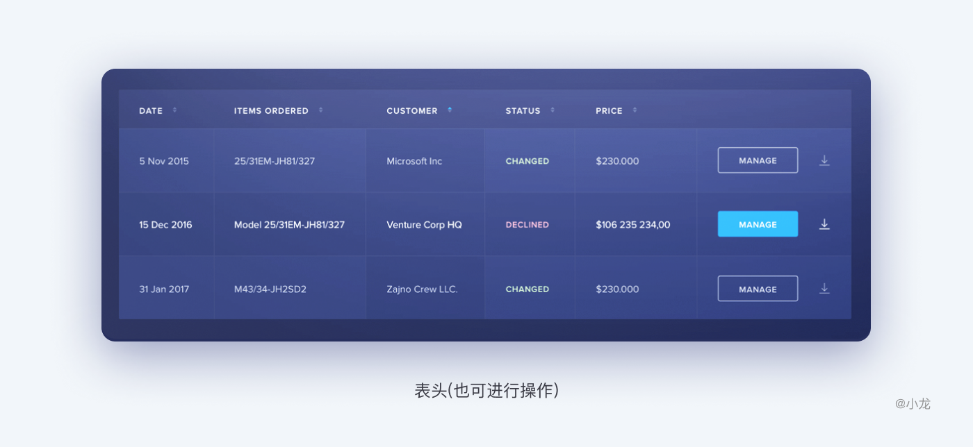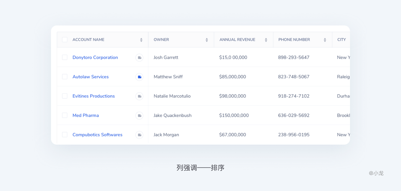 表頭排序可以輔助用戶快速挖掘出需要關注的信息,發現數據信息之間的關係,一般可按數字大小、文字拼音順序、字母順序等其它數據特徵進行排序。如果表格中不是所有數據都能排序時,則需要標識出可排序操作的列,一般採用三角箭頭做為標識,實時反饋當前操作狀態。