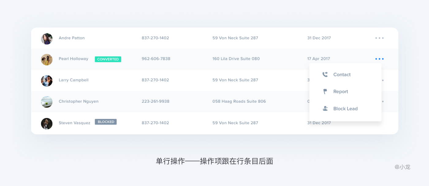 表格數據的操作大體可分為顯性與隱性。顯性操作,指操作選項顯示在行內,直觀明了;隱性操作,當鼠標懸停時或勾選才顯示操作選項,界面簡潔明快,可減輕空間壓力,減少干擾。