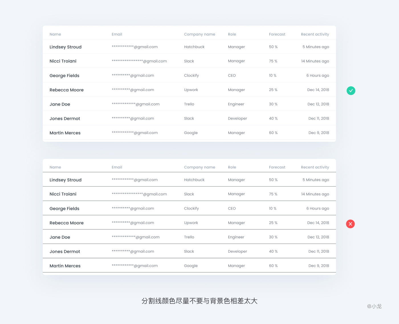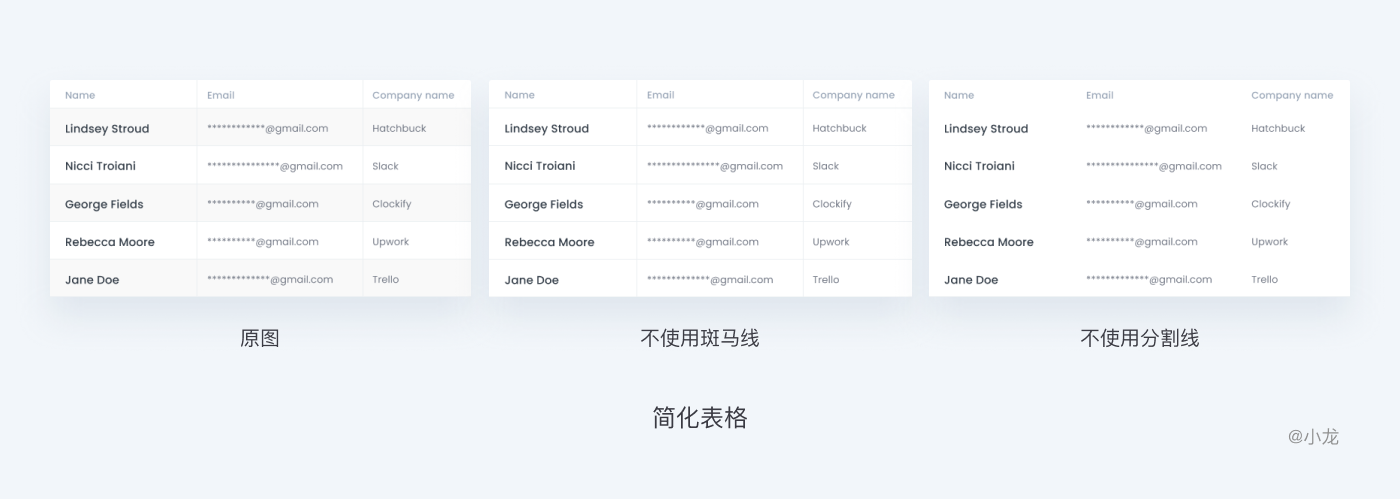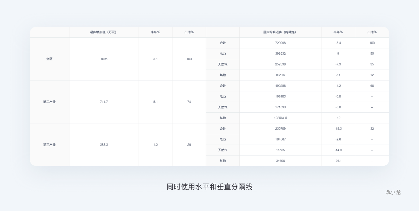 如果在表格中使用適合的對齊方式,分隔線就是多餘的。但由於表格數據量級不同,即使要用,分隔線也要淡,不能妨礙快速瀏覽。
