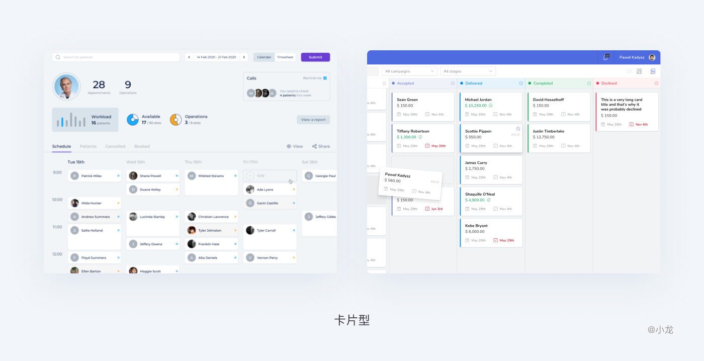 卡片是一種承載信息的容器,對可承載的內容類型無過多限制,它讓一類信息集中化,增強區塊感的同時更易於操作;卡片通常以網格或矩陣的方式排列,傳達相互之間的層級關係。適合較為輕量級和個性化較強的信息區塊展示。