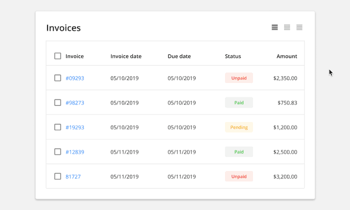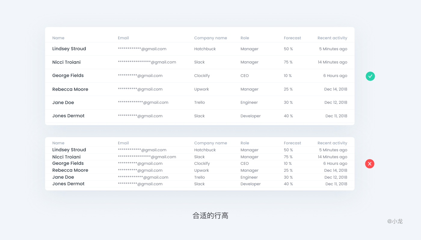 較小的行高讓用戶無需滾動頁面就能查看到更多的數據,但可掃描性的效果易導致視覺迷失。這就是為什麼許多成功的數據表設計包含了控制行高(顯示密度)的功能。