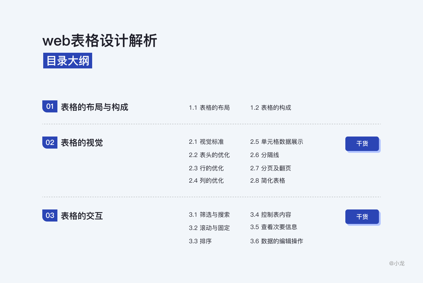 表格,展示行列數據,既是一種可視化交流模式,又是一種整理數據的手段。表格幫助我們組織和展示信息,同時保證信息的可讀性,從大量信息中找到所需內容;通過合理佈局,感知不同信息間的關聯與區別,進行分析和比較;對數據進行排序、搜索、分頁、自定義操作等複雜行為。