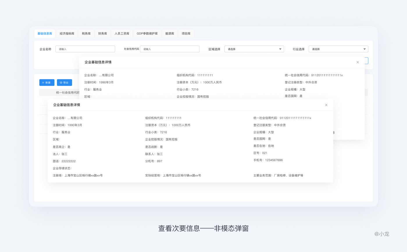 包括模態彈窗和非模態彈窗,模態彈窗是僅支持打開一個彈窗進行詳細查看,非模態彈窗是可以同時打開多個,並允許拖動彈窗位置進行信息對比。