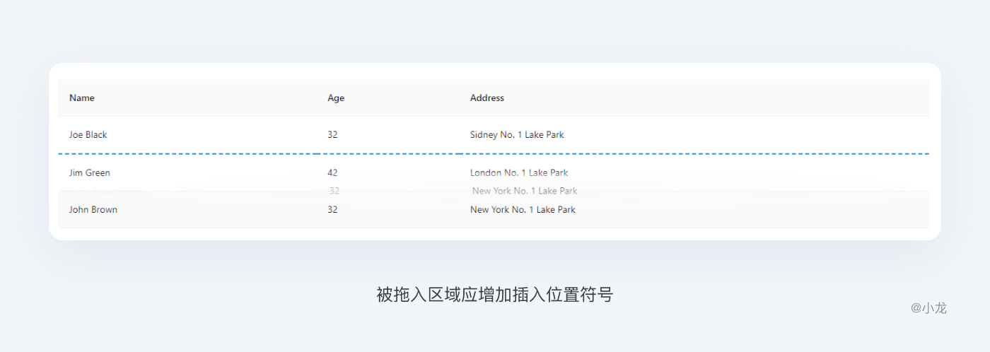 用戶在拖動模塊時,頁面整體佈局基本保持不變。因為移動的不是模塊,而是插入條。插入條指明了放置模塊時的目標位置。常用於數據量較小,有拖曳排序需求的場景。又可以運用在多個表一起的情況。